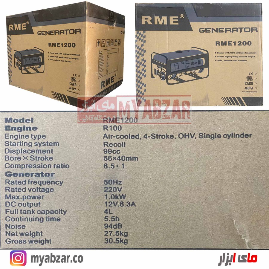 موتور برق 1000 وات مدل RME 1200 , از نوع موتور هواخنک, چهازمانه و تکفاز میباشد. نوع سوخت قابل استفاده بنزین است. فرکانس 50 هرتز است. دارای موتور قدرتمند به توان 1000 وات است که در حالت اوج به 1200 وات هم میرسد. حجم مخزن سوخت 4 لیتر است که باعث بالا رفتن کارایی موتور در حدود 5.5 ساعت میشود. این نوع موتور برق با وزن متوسط 27 کیلوگرم از نوع موتور برق های کوچک و قابل حمل میباشد. در قسمت ژنراتور ، استفاده از سیم پیچ 100% مس و به کار بردن تکنولوژی تثبیت ولتاژ و آمپر (AVR) جهت ثابت کردن خروجی برق که این قابلیت، این امکان را در این موتورها فراهم مینماید که بتوان در هر نوع دستگاهی اعم از مکانیکی و الکترونیکی فوق حساس نیز استفاده گردد. مانند (کولر کوچک ابی،یخچال هتلی،تلویزیون،لپ تاپ و ....). یکی دیگر از محاسن ویژه موتور برق RME کم صدا بودن آن است که علت آن این است که بدلیل داشتن احتراق کامل سوخت و بهره بردن از اگزوز فعال و همچنین استفاده از موتورهای بزرگتر نسبت به نیاز ژنراتور، باعث میگردد موتور کمتر گاز بخورد.
