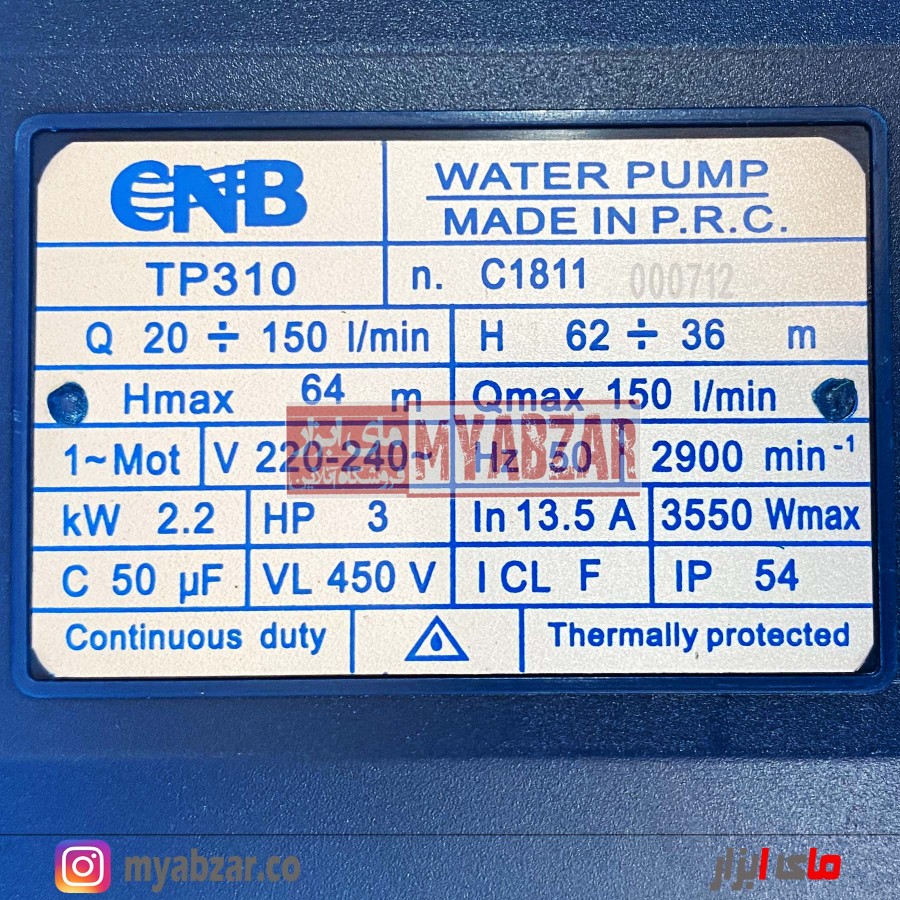 پمپ آب 3 اسب 2 پروانه سی ان بی مدل CNB TP310