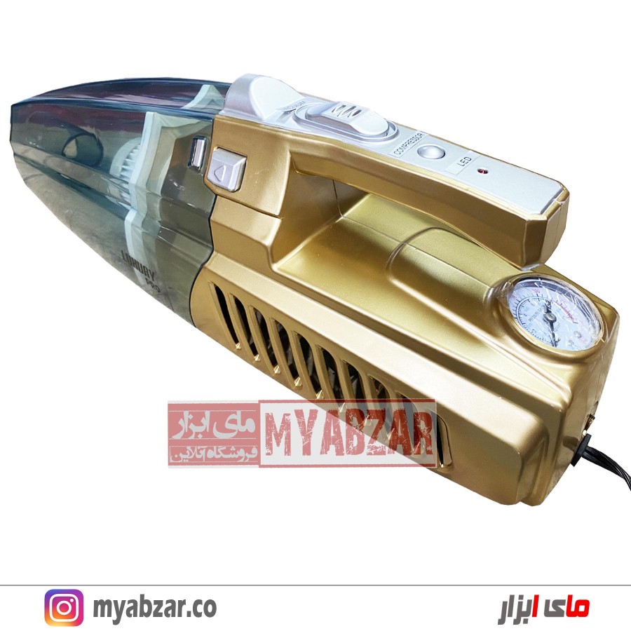 کمپرسور باد و جارو فندکی مخصوص خودرو(12 ولت) در ابعاد 46×25×15 سانتیمتر عرضهشده و وزن آن 2300 گرم است. این محصول حجم کوچکی دارد و برای حمل در خودرو بسیار مناسب است. این کمپرسور توانی برابر 120 وات دارد و دبی خروجی هوای آن 30 لیتر بر دقیقه است. حداکثر فشار خروجی این کمپرسور 135 پی اس آی (9.3 بار) بوده و دارای فشارسنجی مناسب است که میتواند تایر یک خودروی معمولی را در 5 دقیقه پر نماید .