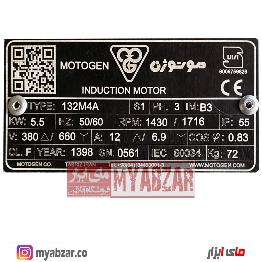 الکتروموتور 3 فاز موتوژن پوسته چدنی1500 دور 5.5 MOTOGEN kw