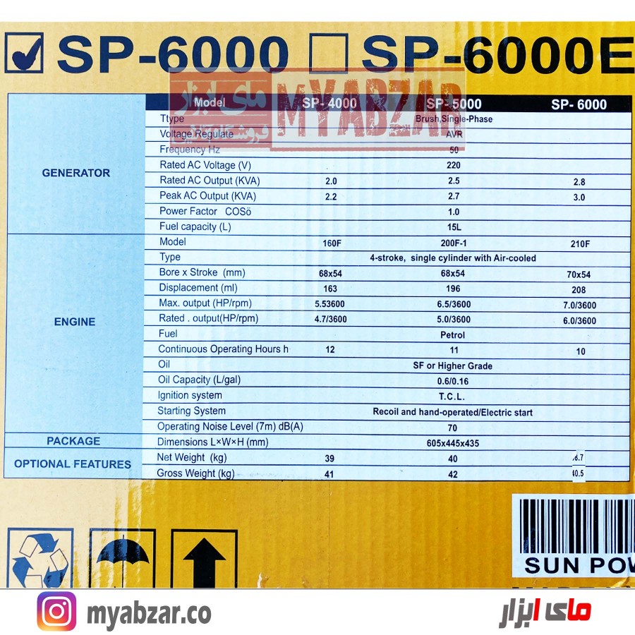 مشخصات فنی موتور برق 3000 وات سان پاور مدل SP-6000