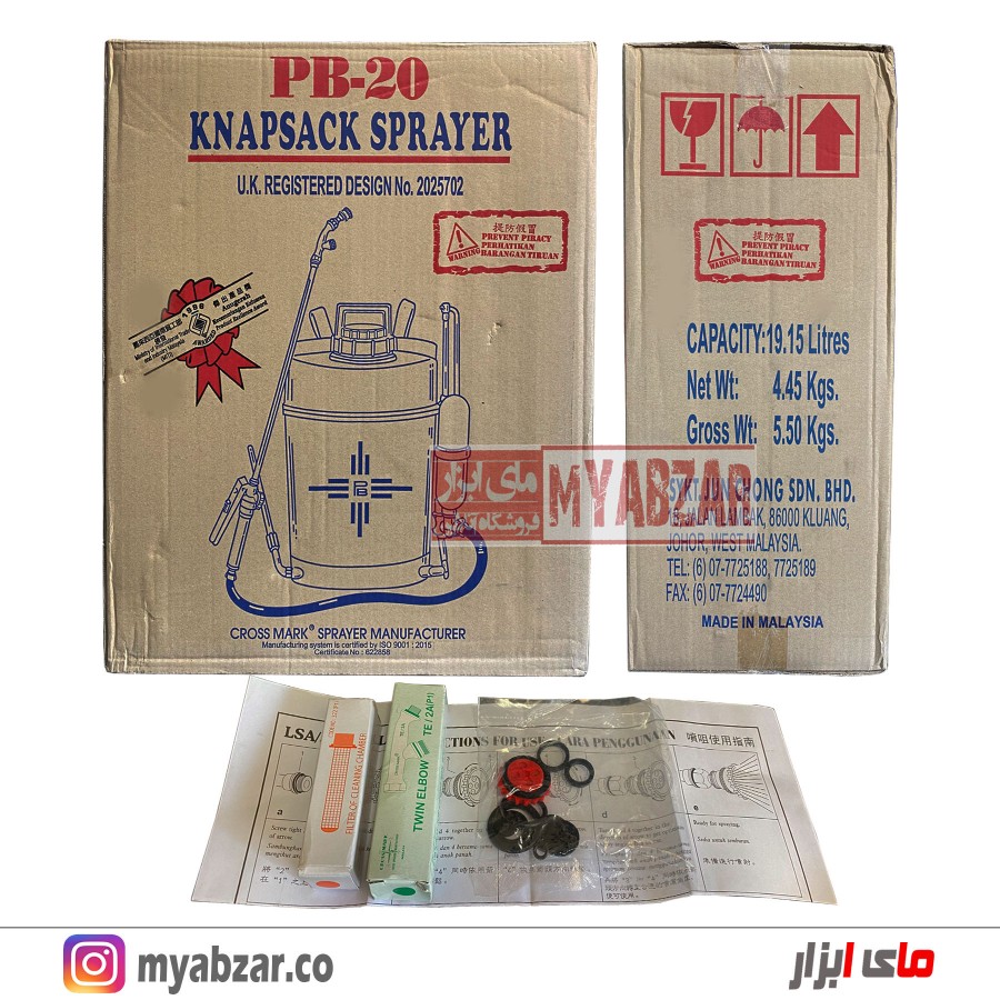 یکی از مشکلاتی که باغبانان و کشاورزان با آن روبرو هستند آفت های موجود برای گیاهان و محصولات گیاهی می باشد،که با استفاده از سموم تولید شده آنها را از بین می برند.اما برای این کار نیاز به سم پاش است.سمپاش ها در سایز ها و طرح های مختلف ساخته شده اند.سمپاش مالزی 20 لیتری مدل کراس مارک PB20 (پمپ برنزی) یکی از سمپاش های موجود در بازار با ظرفیت 20 لیتری می باشد این سمپاش ترکیبی از کیفیت و طراحی می باشد. این سمپاش دارای لانس ، نازل ، و یک سوئیچ ارگونومیک است که مناسب استفاده در شرایط مختلف است، مواد اولیه استفاده شده در این محصول از پلی پروپیلن با درجه کیفی بالایی که در برابر مواد شیمیایی واکنش نشان ندهد و این امر باعث افزایش طول عمر سمپاش و مقاومت و استحکام بالا می شود. دارای پاشش 750 سانتی متر در فشار 2.5 بار در حالت عمودی و برای حالت افقی 850 سانتی متر در فشار 2.5 بار می باشد وزن این محصول 5500 گرم است. این محصول ساخت کشور مالزی است.