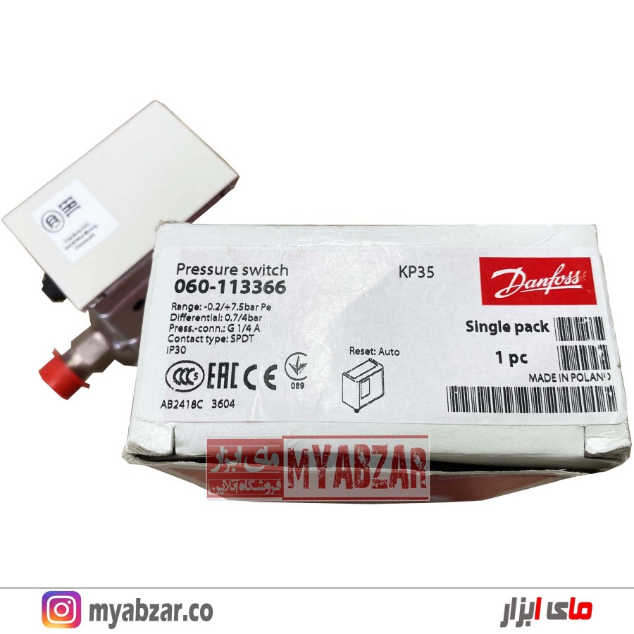 پرشر سوئیچ دانفوس KP35 برای کنترل فشار آب تکفاز برند دانفوس (Danfuss) مدل کی پی ۳۵ محصول شرکت Danfoss دانمارک و ساخت لهستان است.