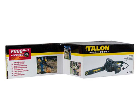اره زنجیری فوق یکی از محصولات تولیدی شرکت «تالون » است. این دستگاه انرژی مورد نیاز خود را از انرژی الکتریکی تامین میکند و یک اره زنجیری برقی محسوب میشود. طول ریل این دستگاه 40 سانتیمتر است و وزنی حدود 4.7 کیلوگرم دارد. قدرت موتور این ابزار 2000 وات بوده و سرعت چرخشی آن 7000 دور بر دقیقه اندازهگیری شده است. سرعت خطی زنجیر دستگاه نیز 800 متر بر ثانیه بوده و طول برش آن حدود 40 سانتیمتر است. این اره زنجیری با برق 220 ولت شهری کار میکند و از دیگر مزایای آن میتوان به وجود محافظ دست، دنده انتقال قدرت فلزی، عایق دوبل، و پمپ روغن اتوماتیک اشاره کرد.
