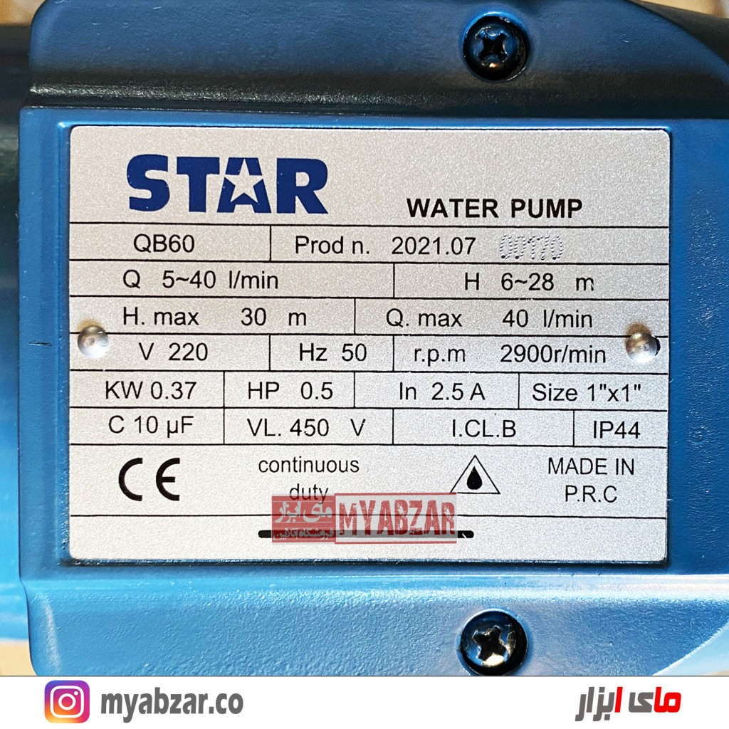 مشخصات فنی پمپ آب نیم اسب استار مدل STAR QB60