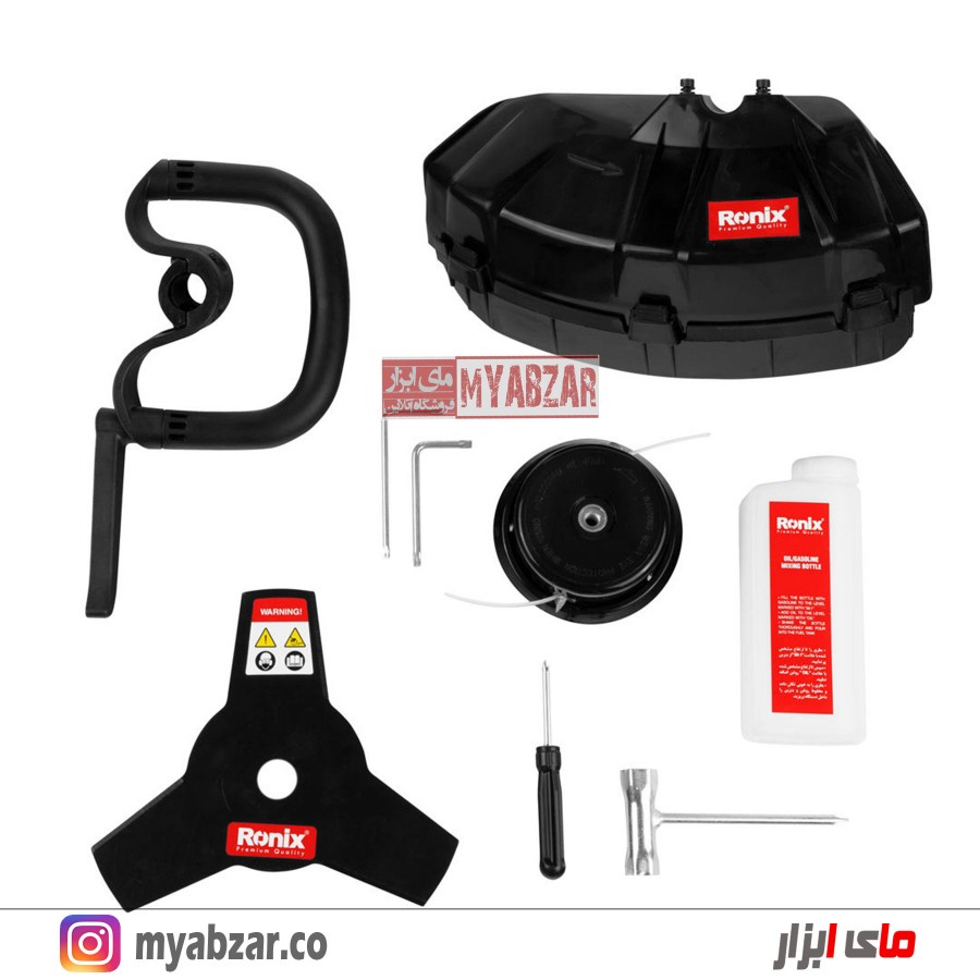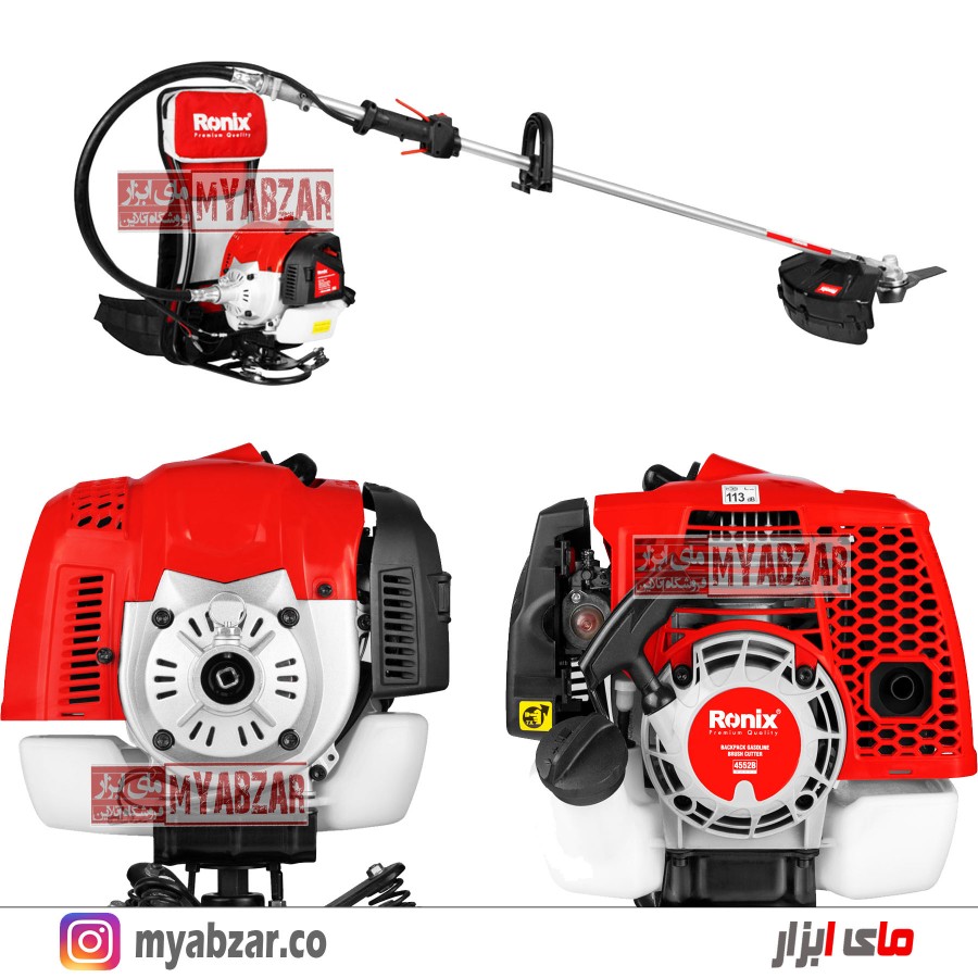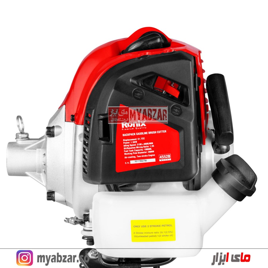 - این علف تراش به موتور 2 زمانه بنزینی رونیکس مدل 4552B با کیفیت عالی مجهز گردیده است.
