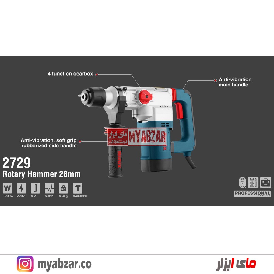 دریل بتن کن رونیکس مدل Ronix 2729 مجهز به موتور قدرتمند 1200 واتی با قابلیت تنظیم دستگاه برای اجرای 4 عملکرد مجزا اعم از سوراخکاری، سوراخکاری چکشی، تخریب و هرزگرد مته