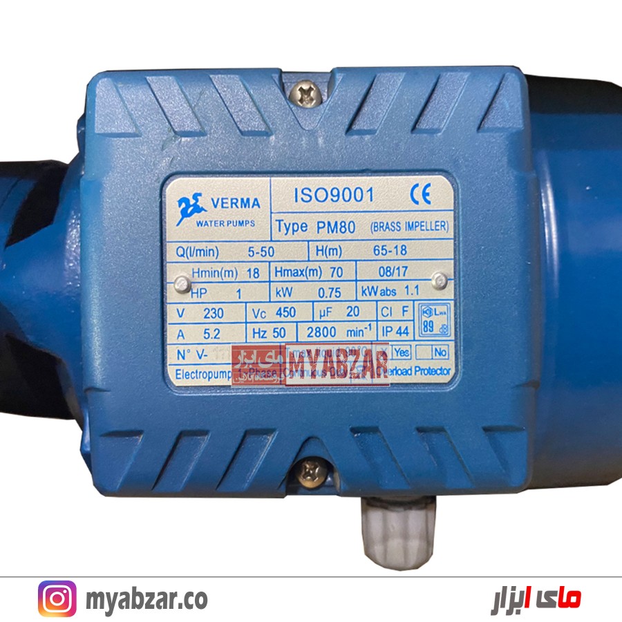 پمپ یک اسب فشار قوی ورما مدل PM80 - از ویژگی های این پمپ میتوان به میزان انتقال اب تا ارتفاع 65 متر و همچنین کیفیت قطعات استفاده شده از قبیل سیم پیچی مس ,شفت استیل و پروانه برنجی اشاره کرد.ساخت چین