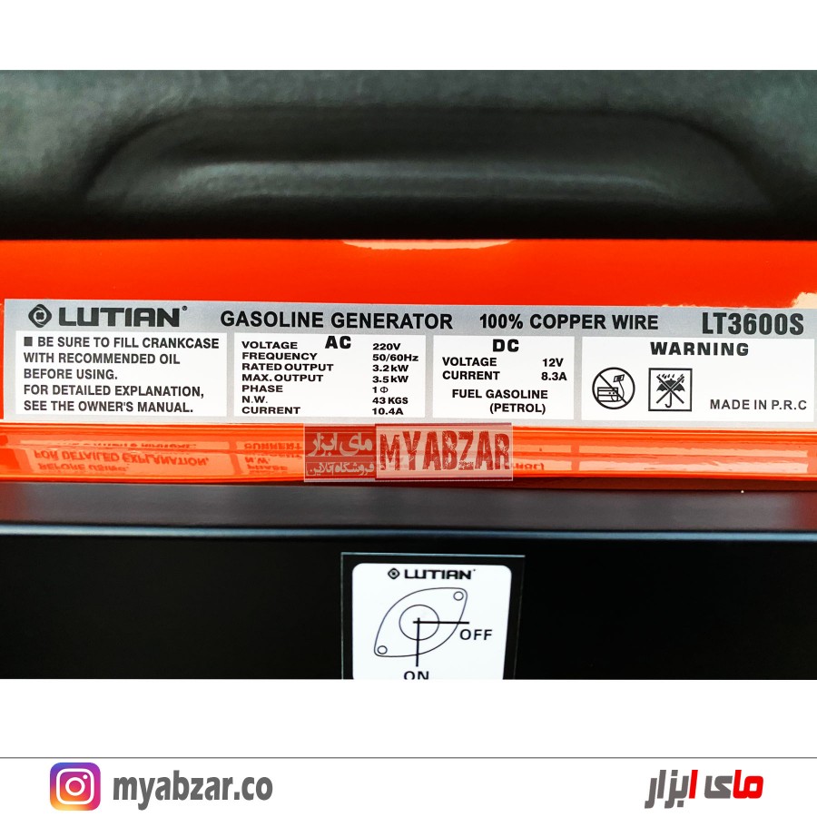 موتور برق لوتیان 3500 وات مدل LUTIAN LT3600S , از نوع موتور هواخنک, چهازمانه و تکفاز میباشد. نوع سوخت قابل استفاده بنزین است. فرکانس 50 هرتز است. دارای موتور قدرتمند به توان 6.5 اسب است که در حالت اوج به خروجی برق 3500 وات میرسد.
