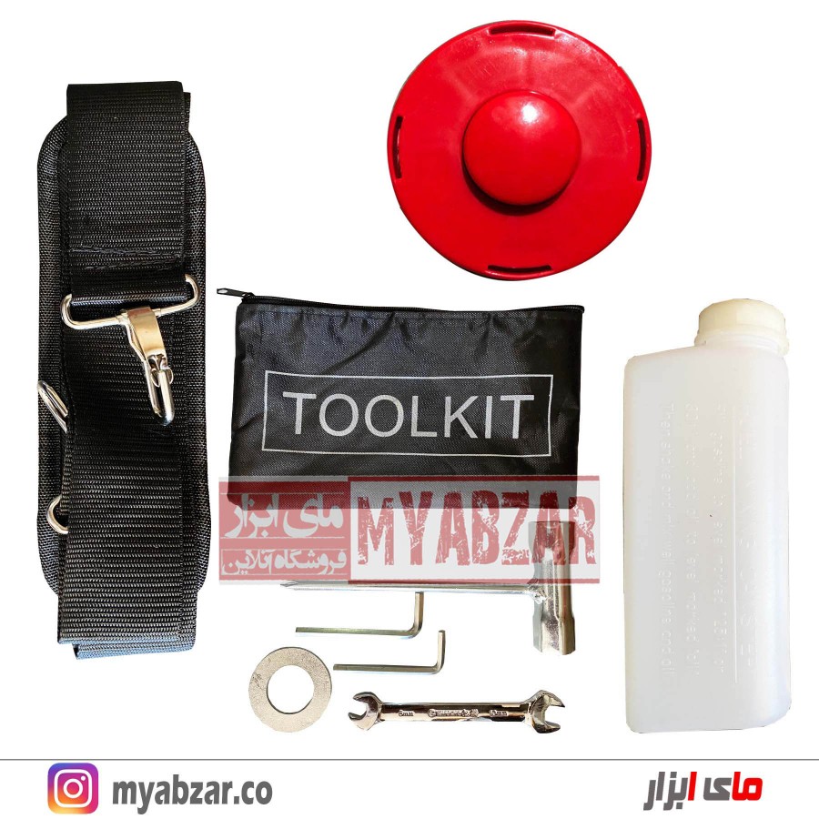 اقلام همراه | تیغ برش نخ نایلونی، تیغ برش فلزی، بطری ترکیب روغن و بنزین، محافظ، آچار آلن |