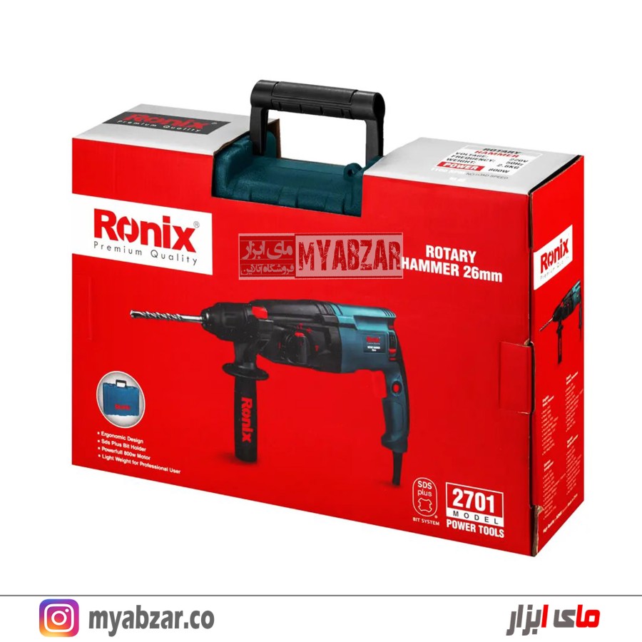 2701 با بهره مندی از سه نظام حرفه ای SDS Plus 26 میلی متری با مکانیزم قفل خودکار این امکان را در اختیار کاربران قرار داده تا بالاترین قدرت را در حین انجام کار در اختیار داشته باشند و به راحتی کارها را به سرانجام مدنظر برسانند. بتن کن 2701 رونیکس با طراحی حرفه ای و وزن تنها 2.6 کیلوگرمی خود را به عنوان یک ابزار مناسب برای انجام کارهای طولانی مدت معرفی کرده است. به علاوه دسته جانبی ارگونومیک این ابزار ضد ضربه بوده و قابلیت چرخش 360 درجه را دارد که همین امر کاهش خستگی دست کاربر در حین انجام کار را به دنبال خواهد داشت. در ضمن این بتن کن 26 میلی متری 800 وات به همراه عمق سنج، ذغال یدکی، مته های مختلف و دسته جانبی ارگونومیک در کیف ضد ضربه BMC عرضه می شود.