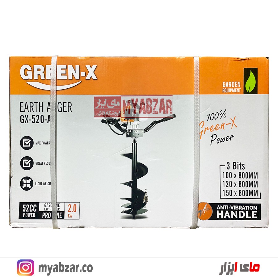 EARTH AUGER- چاله کن بنزینی 52 CC گرین ایکس- دستگاه فوق یکی از ابزارهای بسیار ویژهی باغبانی بوده که به منظور ایجاد گودال و حفره مورد استفاده قرار میگیرد. چاله کن دو نفره GREEN X همراه با 3 عدد مته عرضه میشود.
