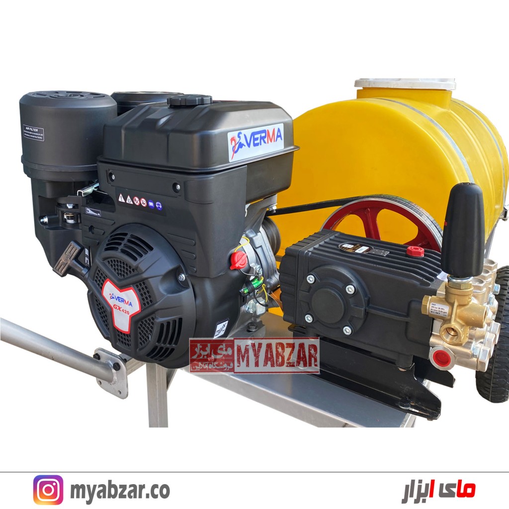 کارواش سیار بنزینی 200 بار اینترپمپ ایتالیا | موتور 15 اسب ورما | شاسی چرخدار با مخزن 200 لیتری
