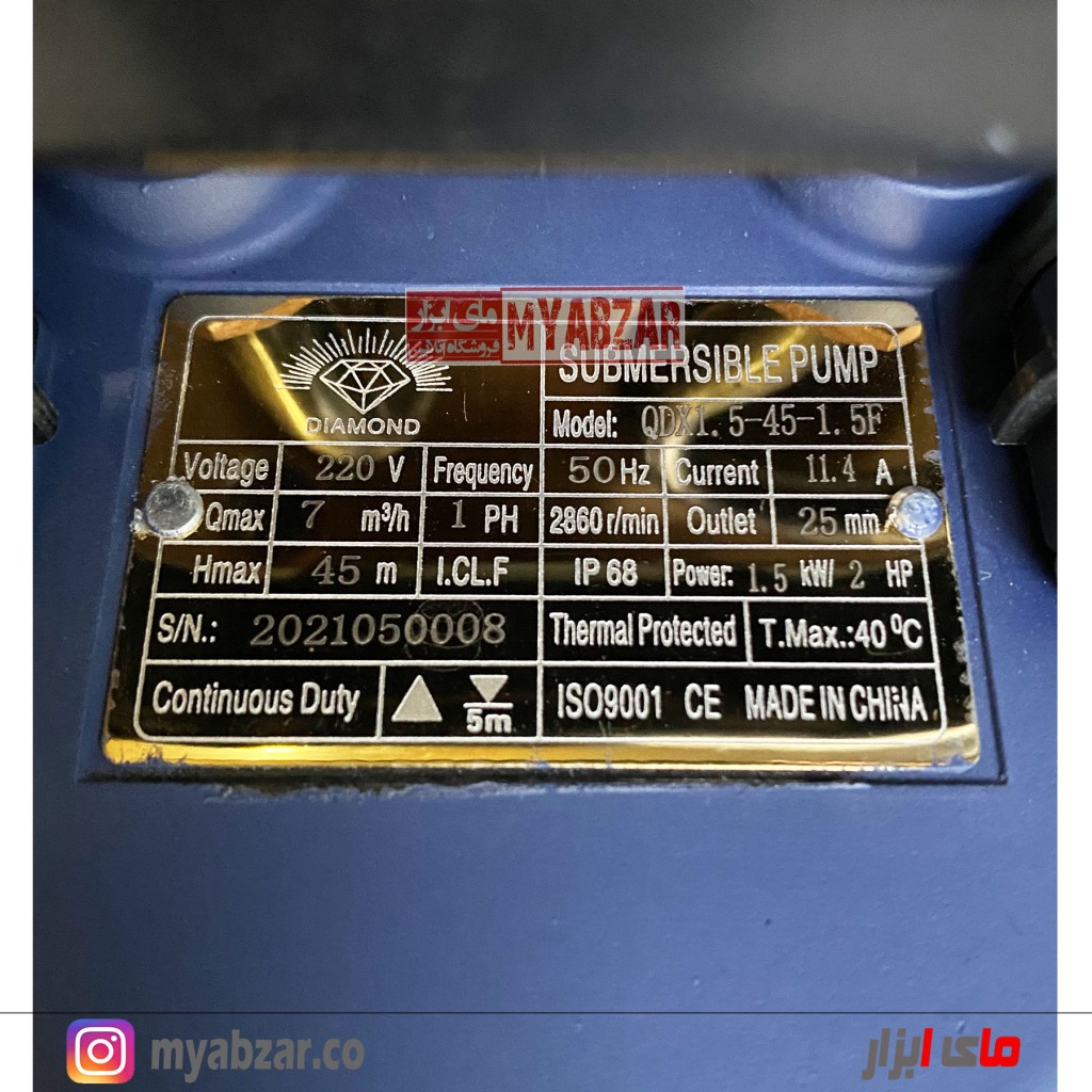 الکتروموتور این پمپ نیز دارای توان 1.5 KW به صورت تک فاز بوده و دارای استاندارد حفاظت IP 68 و کلاس عایق بندی این پمپ F می باشد.