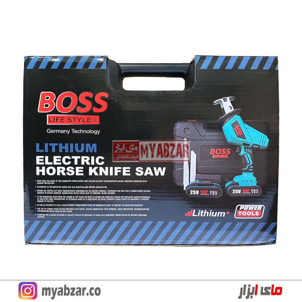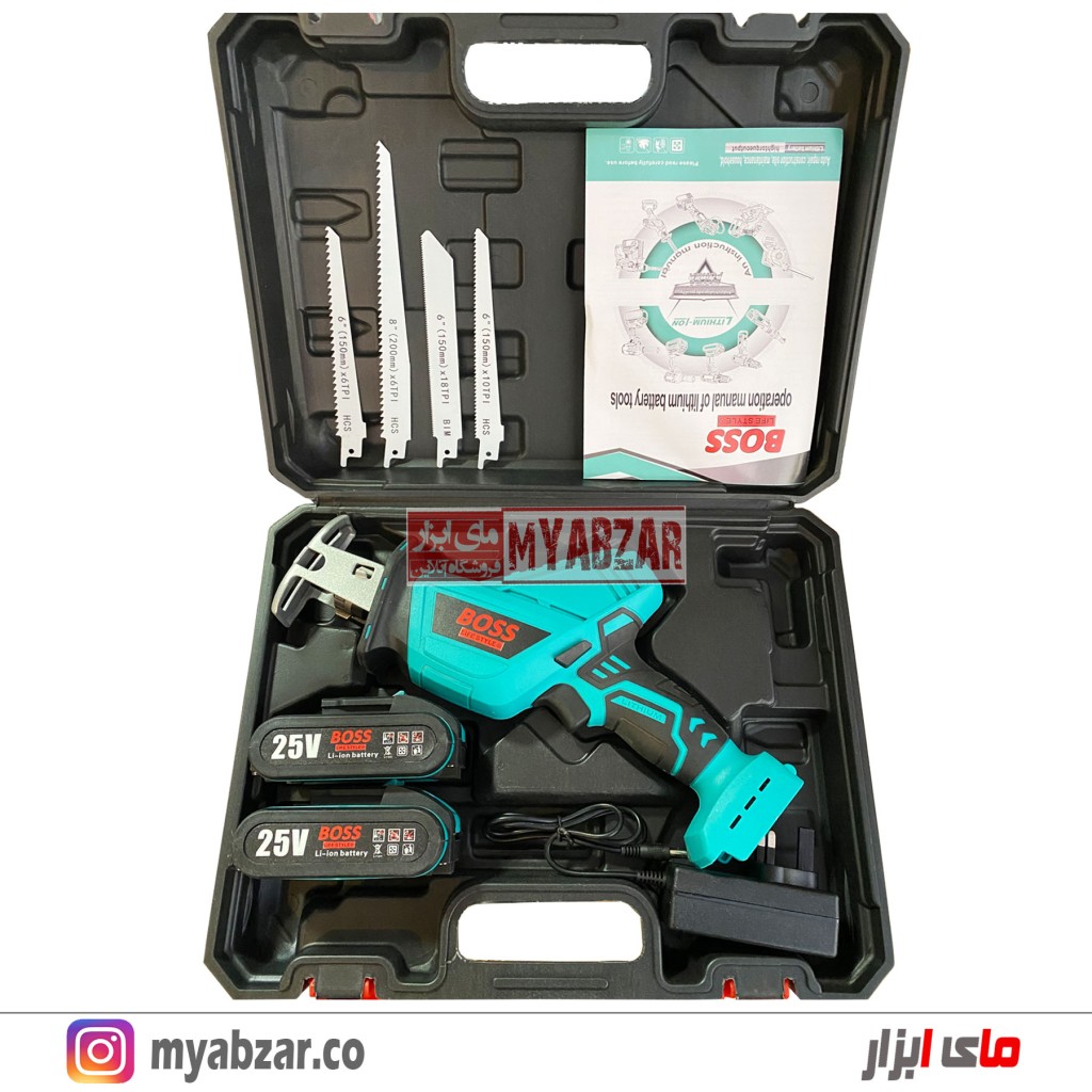 اره افقی بر شارژی باس BOSS با باطری لیتیوم 25 ولت و گشتاور 30 نیوتن متر، مناسب برش انواع چوب، فلز، پلاستیک، استخوان، هرس درختان و ... می باشد دارای دو عدد باتری ۲۵ ولت ۳ آمپر و کیف حمل BMC می باشد