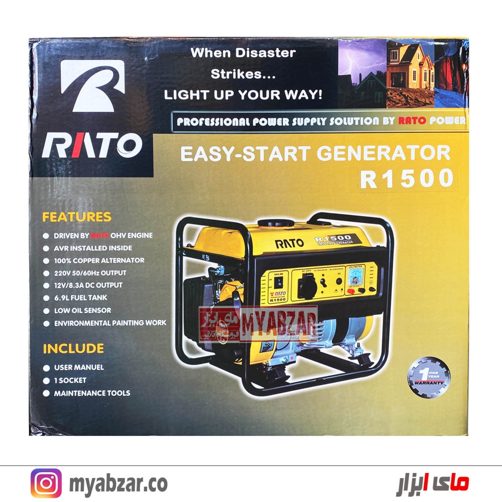 موتور برق راتو مدل RATO R1500 , از نوع موتور هواخنک, چهازمانه و تکفاز میباشد. نوع سوخت قابل استفاده بنزین است. فرکانس 50 هرتز است. دارای موتور قدرتمند به توان 3 اسب است که در حالت اوج به خروجی برق 1000 وات میرسد.