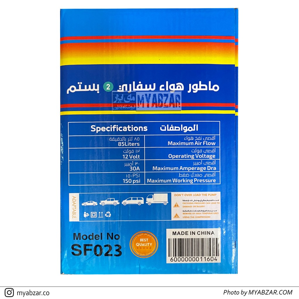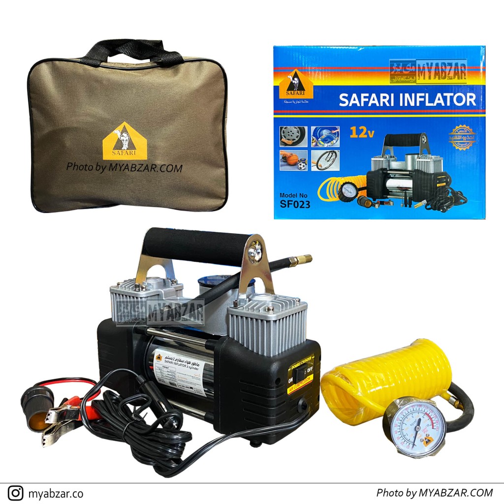 کمپرسور دو سیلندر سافاری مدل SF023 به همراه مجموعهایی از ابزار مورد نیاز در یک کیف برزنتی مستحکم و قابل حمل عرضه میشود.