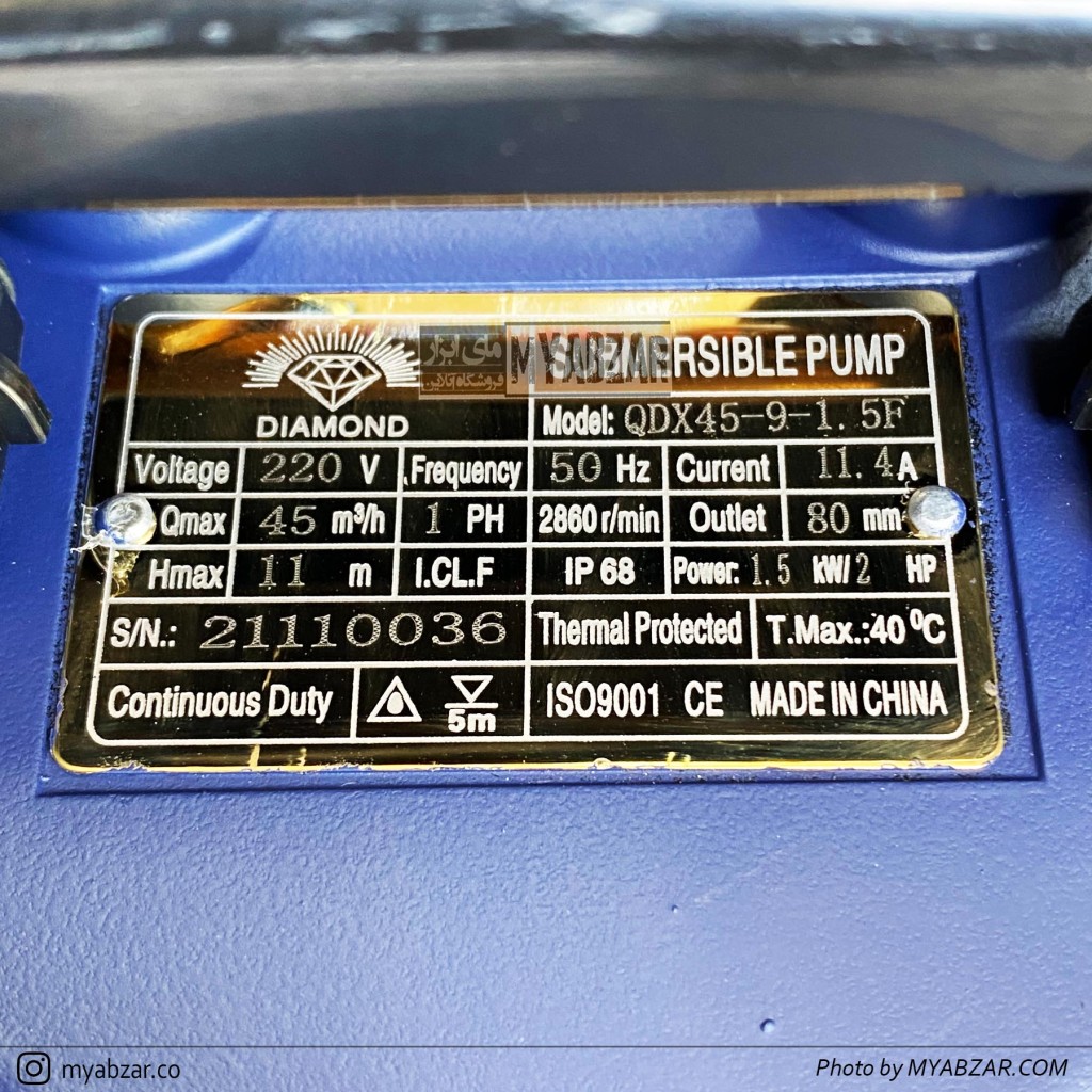 کفکش 11 متری 3 اینچ دیاموند مدل DIAMOND QDX45-9-1.5F مناسب چاه های اب صاف و متراژ 2 الی 10 متر میباشد.