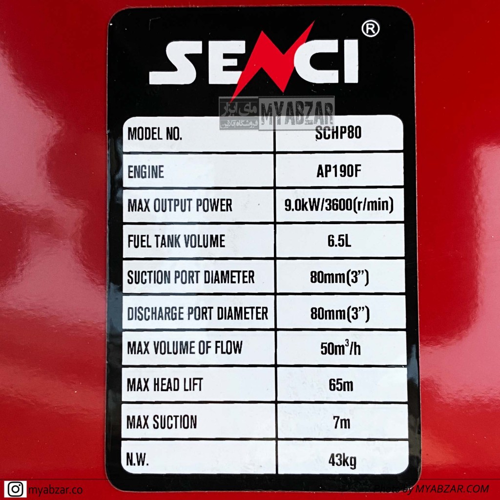 محصولی که اکنون مشاهده می کنید پمپ و موتور آن هر دو ساخت چین می باشند.موتور پمپ ارتفاع بالا سنسی 3 اینچ 65 متری مدل SENCI SCHP80 برای عملکرد از سوخت بنزین استفاده می کند و قطر دهانه ورودی و خروجی آن 3 اینچ می باشد همچنین این موتور پمپ می تواند آب را از ارتفاع 7 متر عمودی مکش کرده و تا ارتفاع مفید 65 متر عمودی یا 700 متر افقی ارسال نماید.
