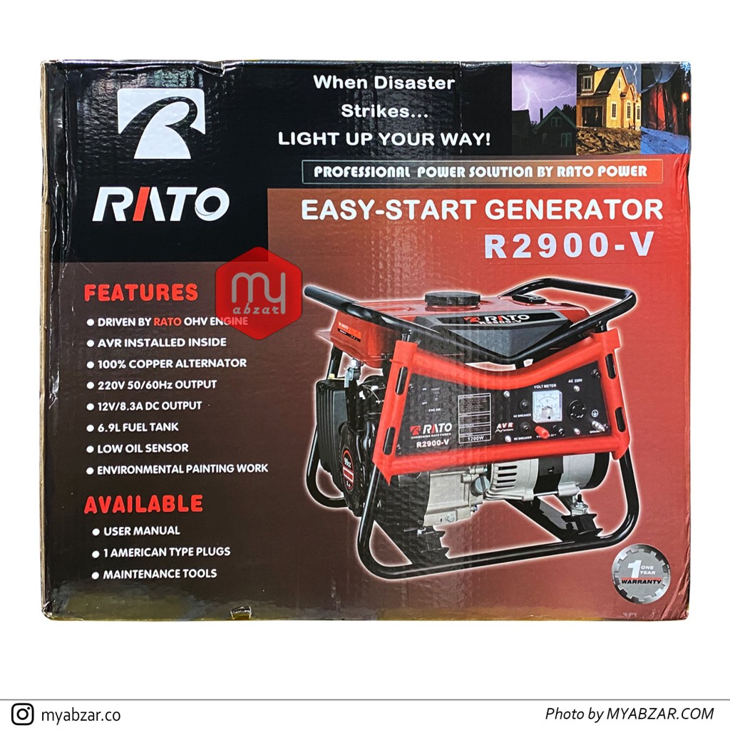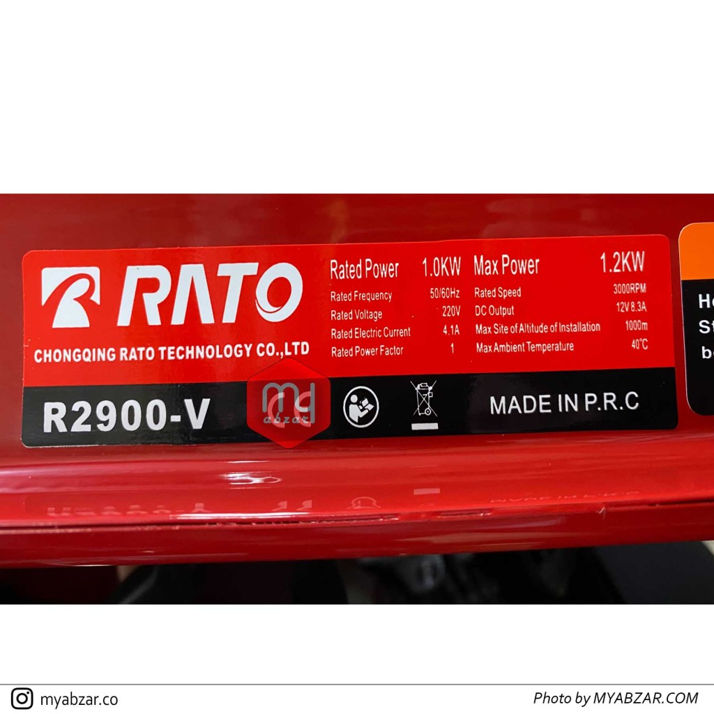 موتور برق راتو مدل RATO R2900 V, از نوع موتور هواخنک, چهازمانه و تکفاز میباشد. نوع سوخت قابل استفاده بنزین است. فرکانس 50 هرتز است. دارای موتور قدرتمند به توان 3 اسب است که در حالت اوج به خروجی برق 1200 وات میرسد.