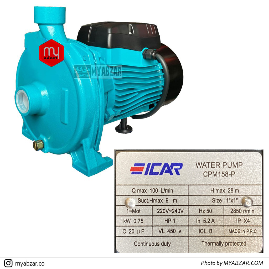 پمپ یک اسب ایکار ICAR از مزایای این پمپ میتوان به میزان انتقال اب تا ارتفاع 28 متر و حداکثر آبدهی 100 لیتر در دقیقه اشاره کرد.سیم پیچی مس, شفت استیل و پروانه پلیمر از دیگر ویژگی های این پمپ میباشد.