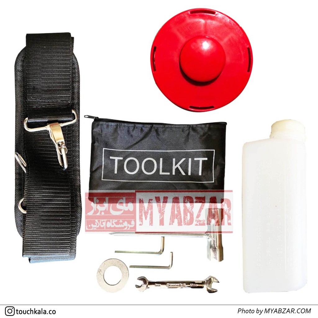 اقلام همراه | تیغ برش نخ نایلونی، تیغ برش فلزی، بطری ترکیب روغن و بنزین، محافظ، آچار آلن |