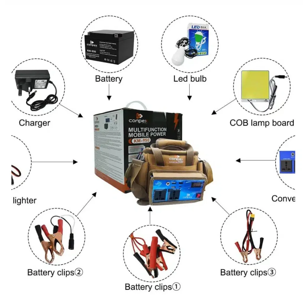 پاوربانک چندکاره کانپکس مدل KM 950 یک منبع انرژی بسیار قوی برای شارژ دستگاه های شما و یا حتی شوک دادن به خودرو در هنگام کمپینگ و مسافرت است. این محصول با ظرفیت 60000 میلی آمپر ساعت با حمل آسان می تواند همراه خوبی در سفرهای کمپینگ باشد.