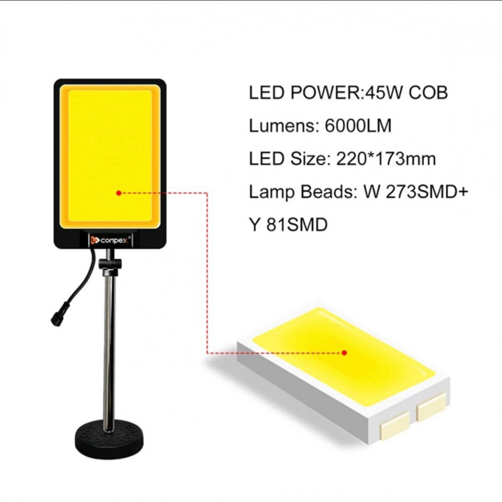 چراغ کمپینگ کانپکس 1200 وات مدل TM-38 COB با پایه آهن ربایی به ارتفاع 15 سانتی متر با یک پنل به اندازه 13.5×21 سانتی متر و توان مصرفی 45 وات می تواند روشنایی مناسبی را برای انجام کارها در شب برایتان فراهم کند.