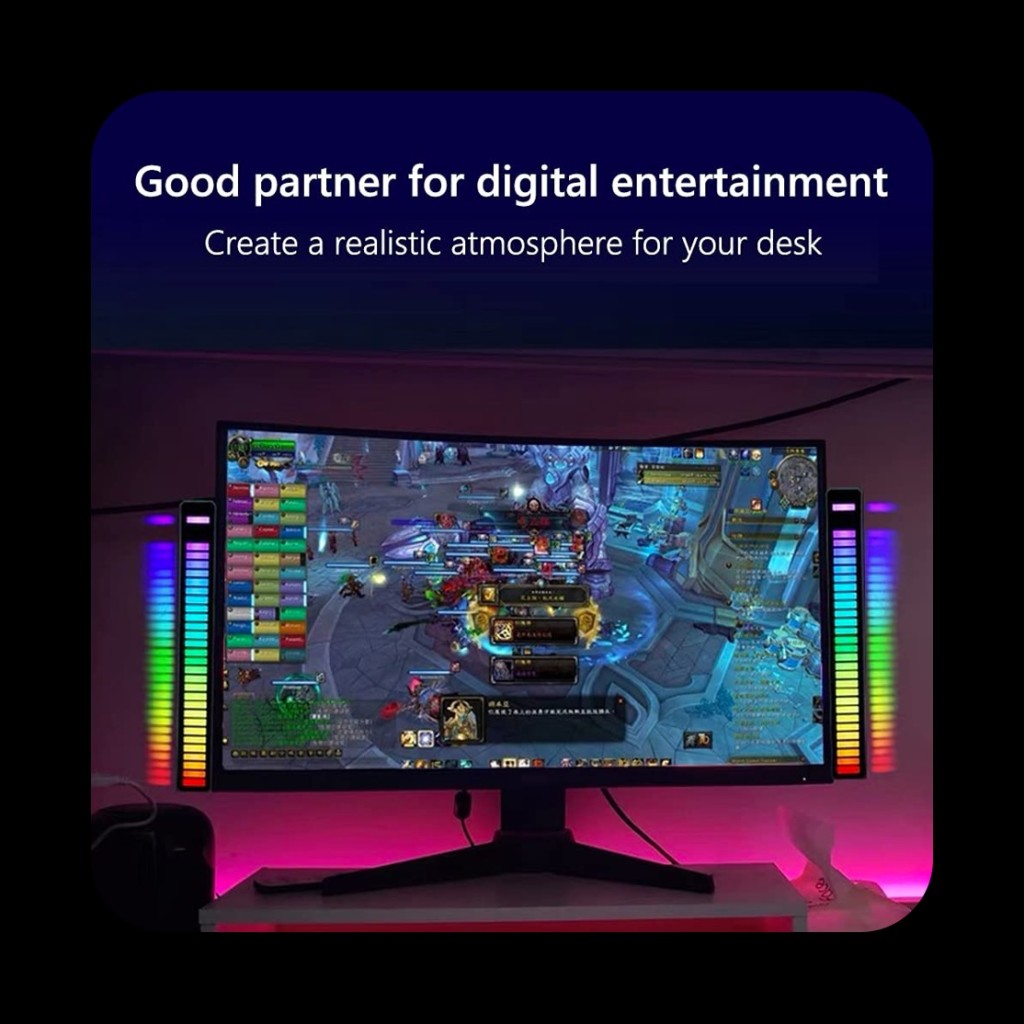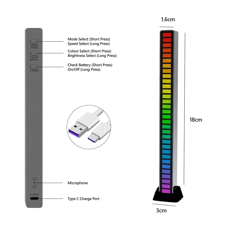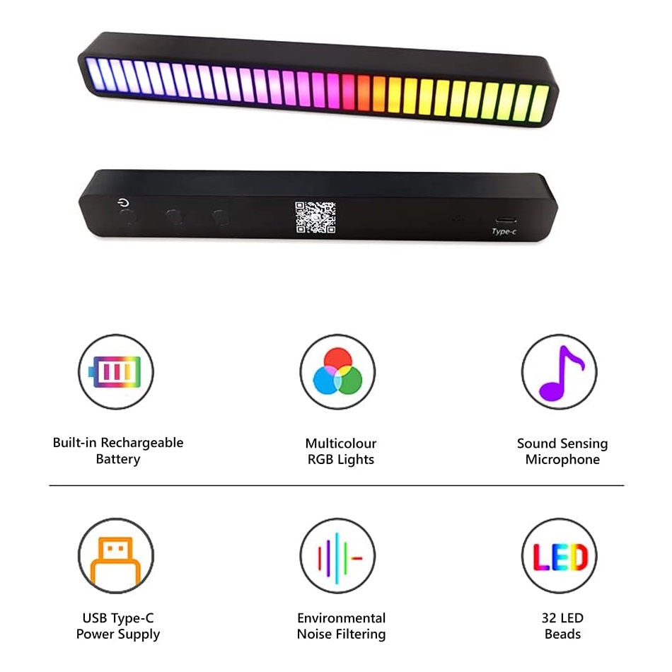 اکولایزر لایت بار RGB حساس به صدا مدل D08-RGB با 32 لامپ رنگی LED IC WS2812 دارای 8 حالت مختلف قابل تنظیم با 18 حالت رنگی، 4 حالت روشنایی و 5 حالت سرعت میباشد.