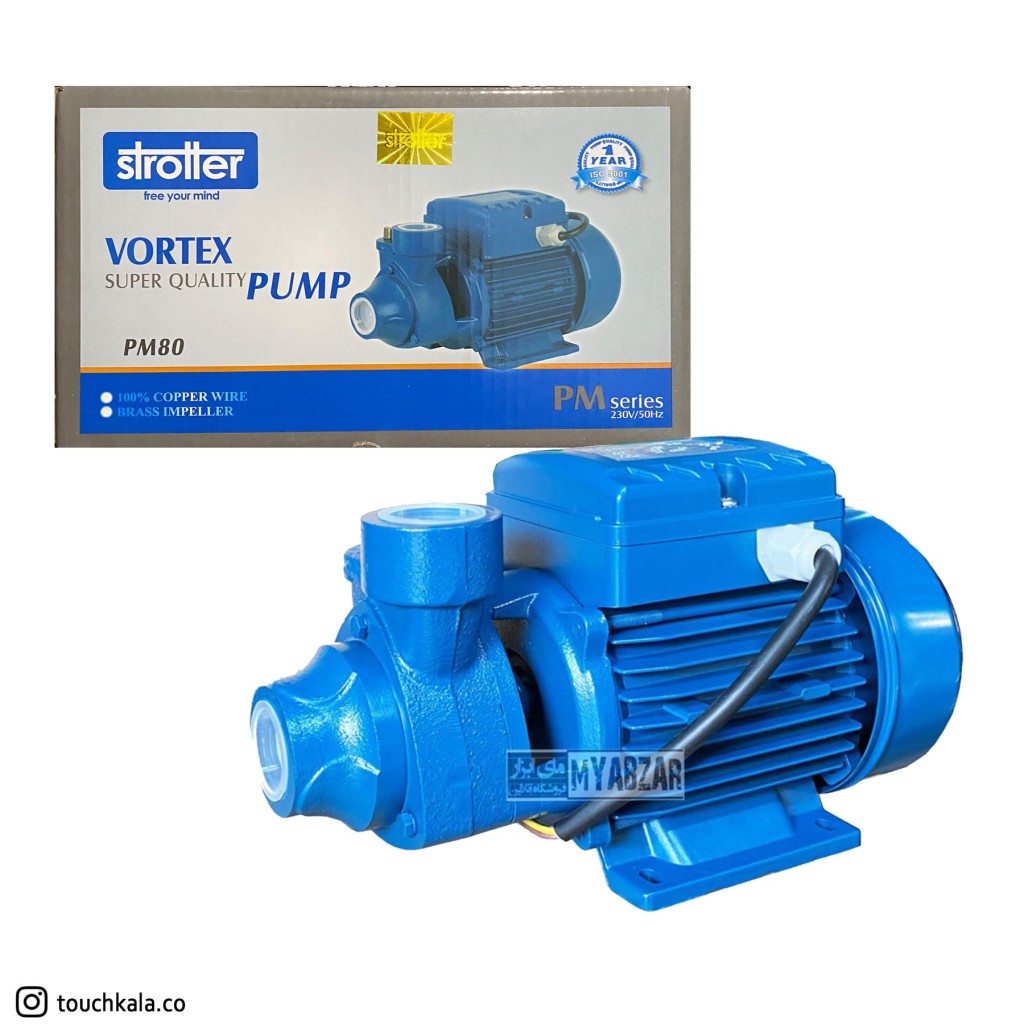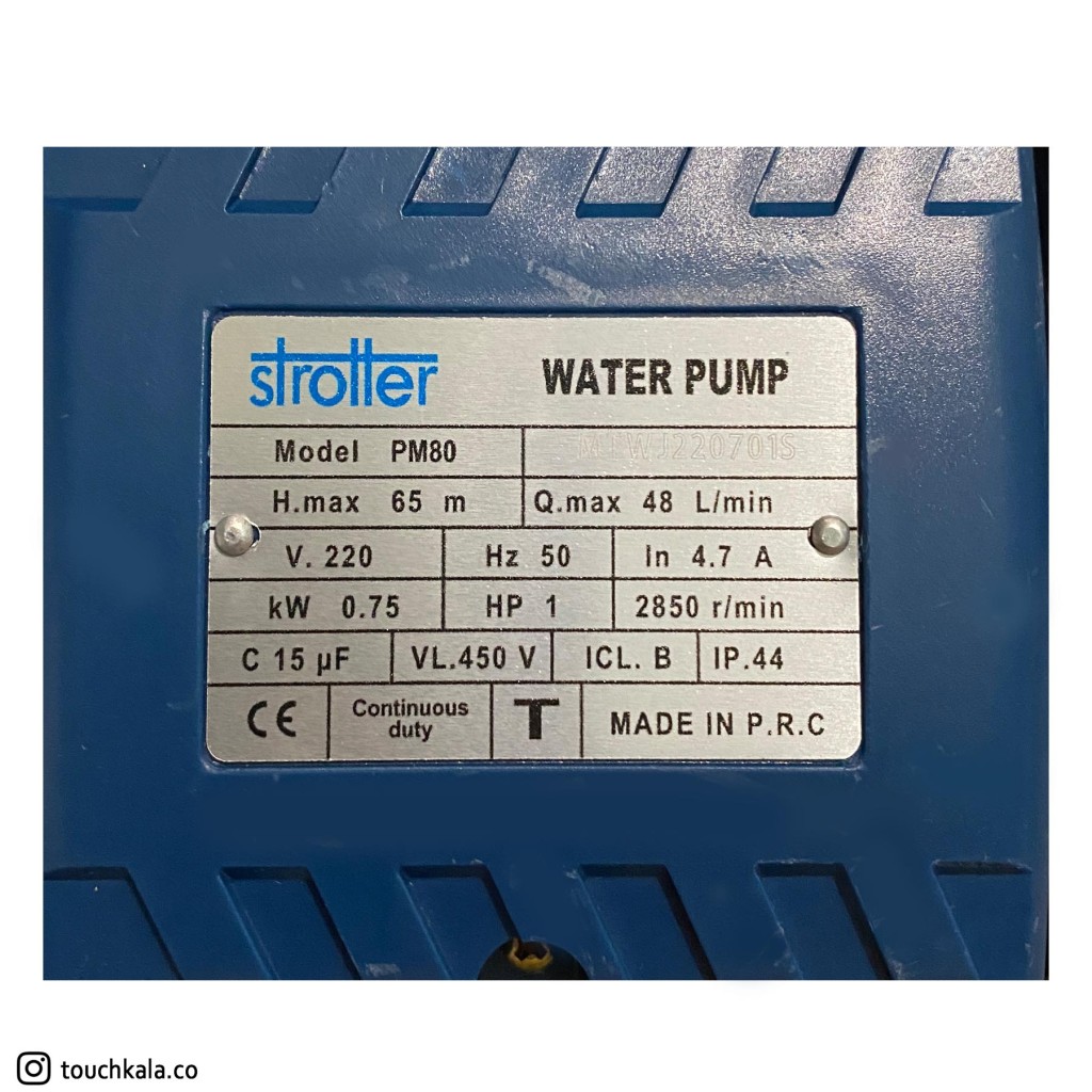 الکتروپمپ استرولر مدل PM80 از مزایای این پمپ میتوان به میزان انتقال اب تا ارتفاع 65 متر و حداکثر آبدهی 48 لیتر در دقیقه اشاره کرد.سیم پیچی مس, شفت استیل و پروانه برنزی از دیگر ویژگی های این پمپ میباشد