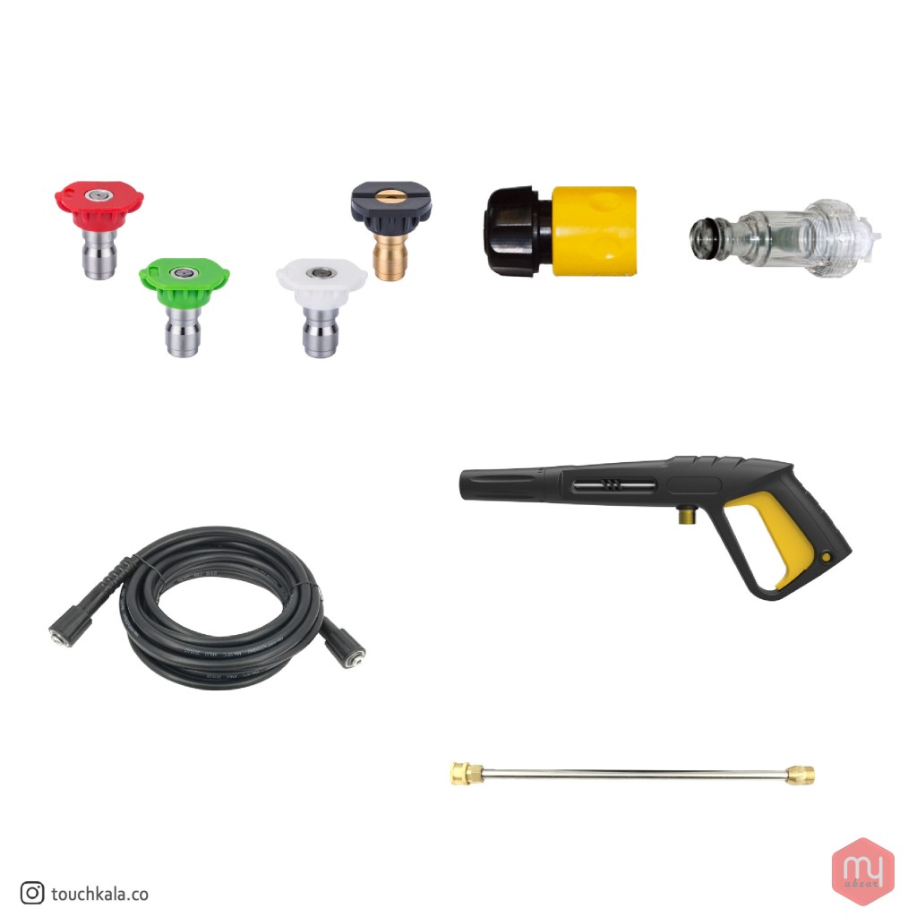- اقلام همراه:تفنگی با النس فلزی – 4 عدد نازل(/40°/25°/0° و کف پاش) – شلنگ فشار قوی 5 متری – مخزن کف پاش – کوپلینگ ورودی آب