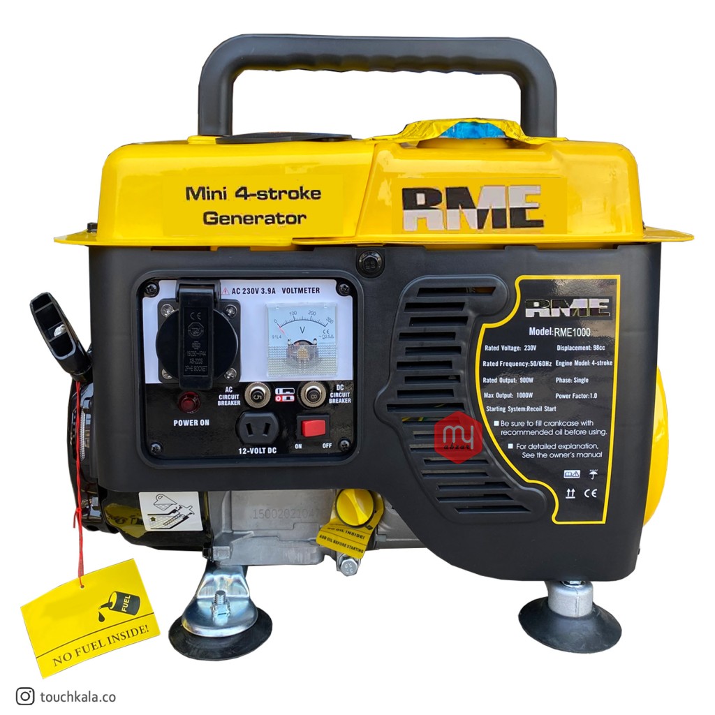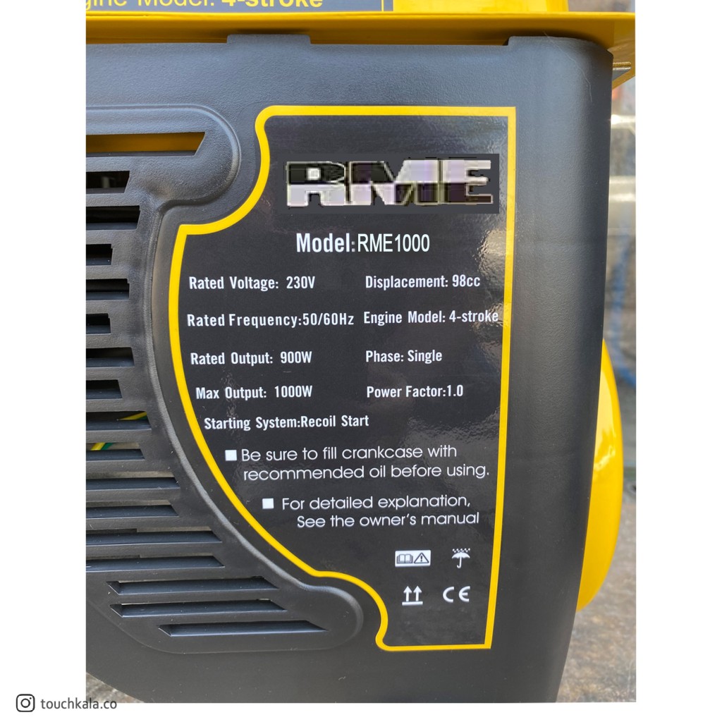 موتور برق ار ام ای مدل RME 1000 , از نوع موتور هواخنک, چهازمانه و تکفاز میباشد. نوع سوخت قابل استفاده بنزین است. فرکانس 50 هرتز است. دارای موتور قدرتمند به توان 1000 وات است که در حالت اوج به 1200 وات هم میرسد. حجم مخزن سوخت 4 لیتر است که باعث بالا رفتن کارایی موتور در حدود 5.5 ساعت میشود. این نوع موتور برق با وزن متوسط 25 کیلوگرم از نوع موتور برق های کوچک و قابل حمل میباشد. در قسمت ژنراتور ، استفاده از سیم پیچ 100% مس و به کار بردن تکنولوژی تثبیت ولتاژ و آمپر (AVR) جهت ثابت کردن خروجی برق که این قابلیت، این امکان را در این موتورها فراهم مینماید که بتوان در هر نوع دستگاهی اعم از مکانیکی و الکترونیکی فوق حساس نیز استفاده گردد. مانند (کولر کوچک ابی،یخچال هتلی،تلویزیون،لپ تاپ و ....). یکی دیگر از محاسن ویژه موتور برق RME کم صدا بودن آن است که علت آن این است که بدلیل داشتن احتراق کامل سوخت و بهره بردن از اگزوز فعال و همچنین استفاده از موتورهای بزرگتر نسبت به نیاز ژنراتور، باعث میگردد موتور کمتر گاز بخورد.