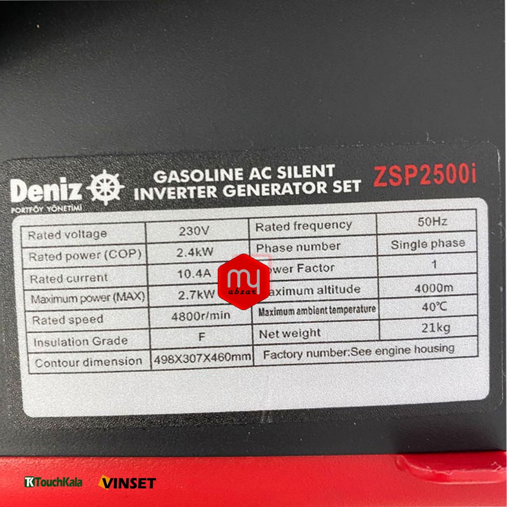 موتور برق دنیز مدل ZSP2500i, از نوع موتور هواخنک, چهازمانه و تکفاز میباشد. نوع سوخت قابل استفاده بنزین است. فرکانس 50 هرتز است. دارای موتور قدرتمند به توان 5 اسب است که در حالت اوج به خروجی برق 2700 وات میرسد.