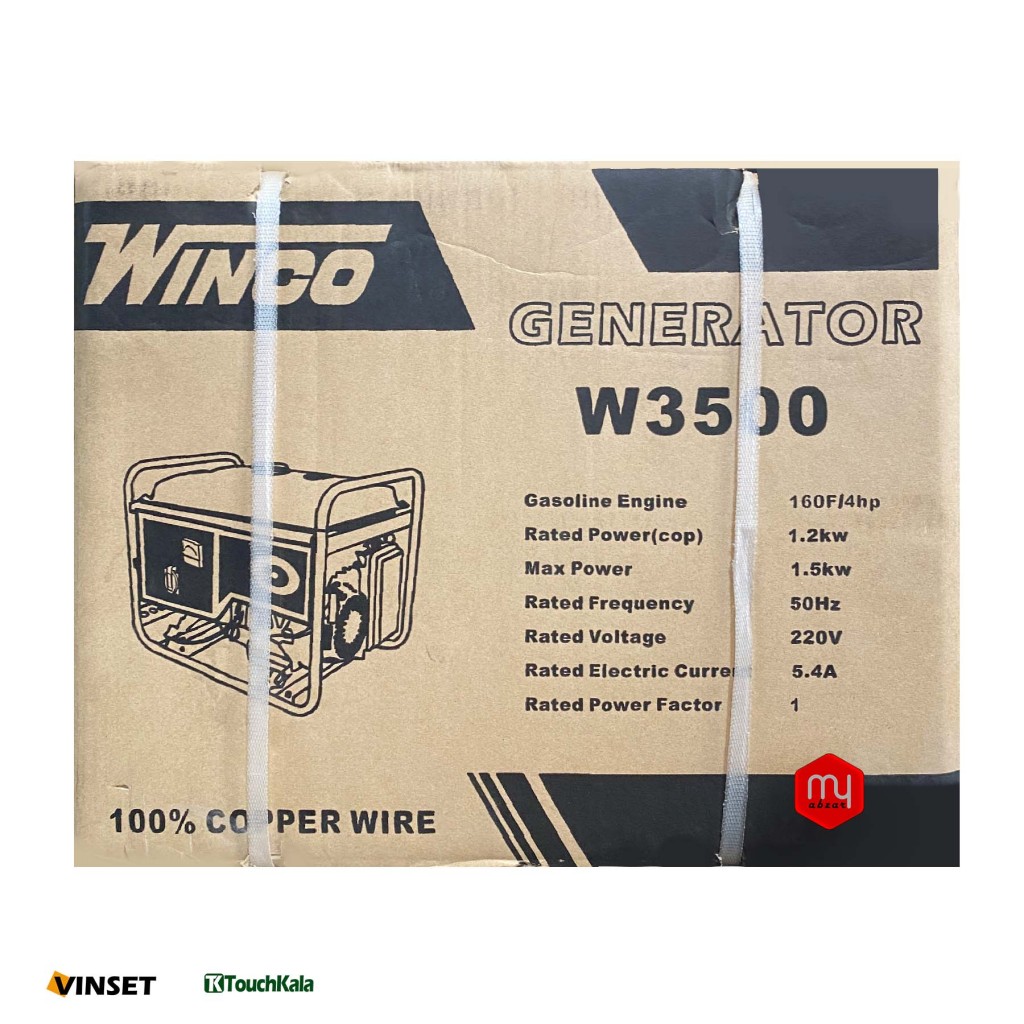 موتور برق بنزینی وینکو مدل W3500 , از نوع موتور هواخنک, چهازمانه و تکفاز میباشد. نوع سوخت قابل استفاده بنزین است. فرکانس 50 هرتز است. دارای موتور قدرتمند به توان 4 اسب است که در حالت اوج به خروجی برق 1500 وات میرسد.