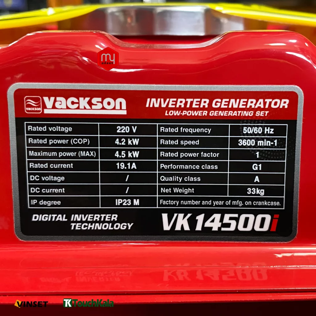 موتور برق بنزینی واکسون مدل VK14500i, از نوع موتور هواخنک, چهازمانه و تکفاز و مجهز به برد اینورتر میباشد. نوع سوخت قابل استفاده بنزین است. فرکانس 50 هرتز است. دارای موتور قدرتمند به توان 9 اسب است که در حالت اوج به خروجی برق 4500 وات میرسد.