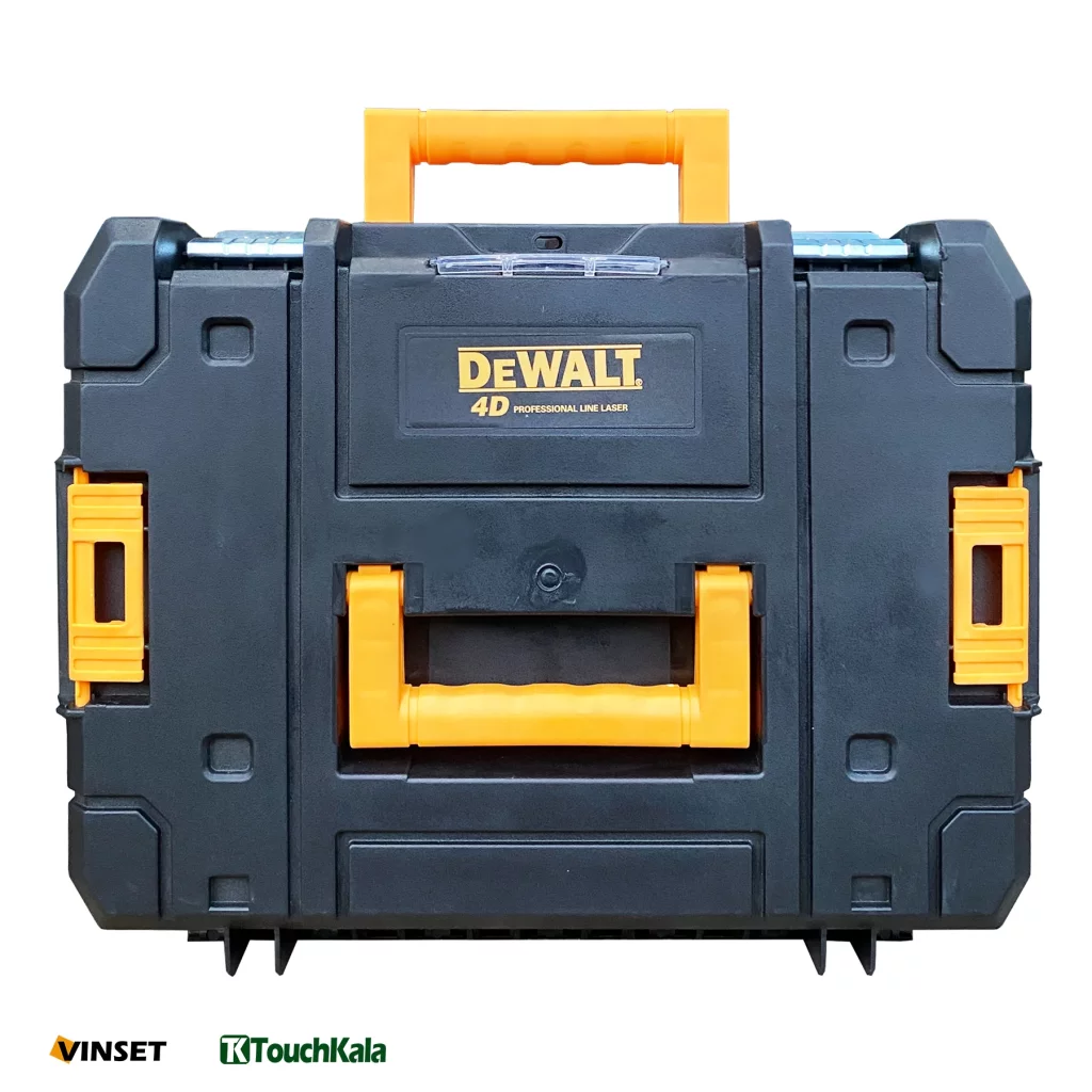 با خرید تراز لیزری 4 بعدی دیوالت 360 4D یک پک کامل از وسایل، داخل یک جعبه ی پلاستکی دریافت خواهید کرد. جعبه ی این مدل بسیار محکم است و به خوبی از محتویات داخل محافظت میکند. رنگ این تراز ترکیبی از مشکی و زرد است. قسمت پایینی تراز فلزی است و قسمت میانی و بالایی ان از پلاستیک ساخته شده است. لیزر ها در این مدل 4 عدد میباشد. دو عدد در طرفین و 1 عدد در بالا و دیگری در پایین دستگاه جای گرفته اند. دکمه ی روشن کردن دستگاه نیز روی بدنه قرار دارد و موقعی که خاموش است حالت خود تراز قفل میشود تا لیزر ها به بدنه داخلی برخورد نکنند و اسیب نبینند.