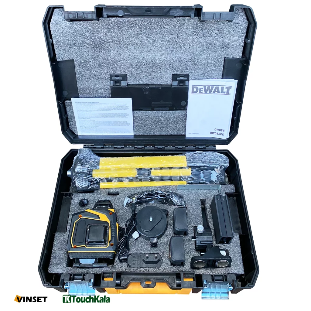 همیشه داشتن ابزار های گوناگون باعث میشود که راحت تر بتوانیم از محصول استفاده کنیم و خوشبختانه تعداد زیادی وسیله ی جانبی همراه تراز لیزری دیوالت وجود دارد. برای استفاده از این تراز لازم است که ان را ساکن و بدون حرکت در محلی قرار دهیم. به همین دلیل بیشتر لوازمی که در جعبه ی این تراز وجود دارد شامل پایه هایی برای قرار دادن تراز روی انها است. یک سه پایه در جعبه به چشم میخورد که ارتفاع ان قابل تنظیم است و اگر لازم است کمد ها یا کابینت هایی که در ارتفاع هستند را تراز کنید میتوانید با تنظیم ارتفاع این سه پایه راحت تراز را برای شروع کار اماده کنید. یک سه پایه کوچک نیز همراه این محصول وجود دارد که قابلیت چرخش دارد و با قرار دادن تراز روی ان میتوانید، راحت به وسیله ی یک پیچ تراز را بچرخانید. پایه ی دیگر یک مدل جک مانند است که با چرخاندن یک پیچ میتوانید ان را باز و یا جمع کنید. اگر لازم است ارتفاع تراز را چند سانتی متر بالا و پایین کنید میتوانید از این پایه استفاده کنید. یک پایه ی اهنربایی نیز وجود دارد که میتوانید با استفاده از ان تراز را به دیوار و یا جا های فلزی متصل کنید. دو عدد باتری و یک عدد شارژر نیز در جعبه دیده میشود و باعث میشود شما به صورت مداوم و بدون معطلی تراز را برای کار در اختیار داشته باشید.