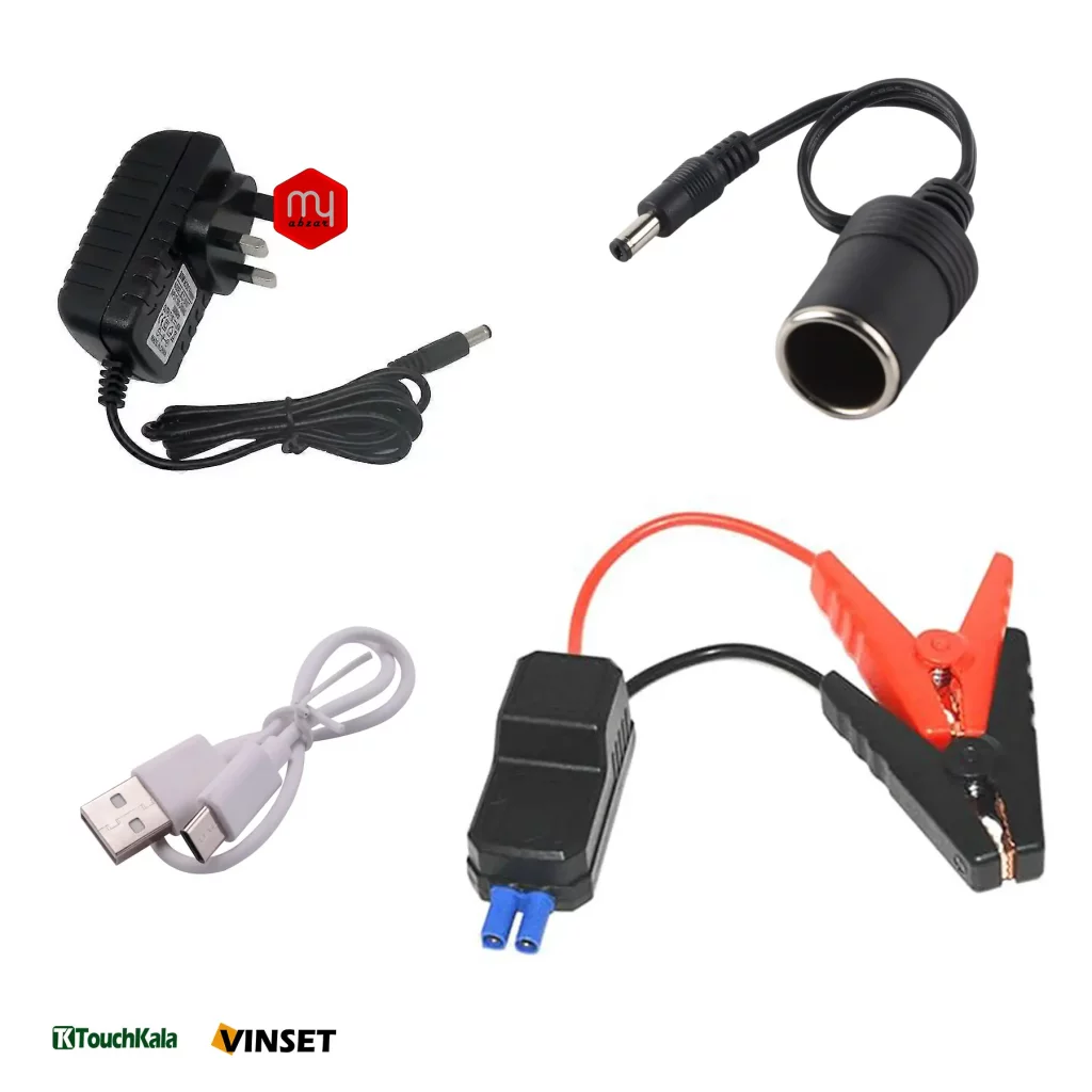 به همراه این پاور ژنراتور، یک عدد اداپتور شارژر, کابل USB ,کابل خروجی فندکی ,شیلنگ و اتصالات پمپ باد و گیره های اتصال به باتری خودرو ارائه میشود.
