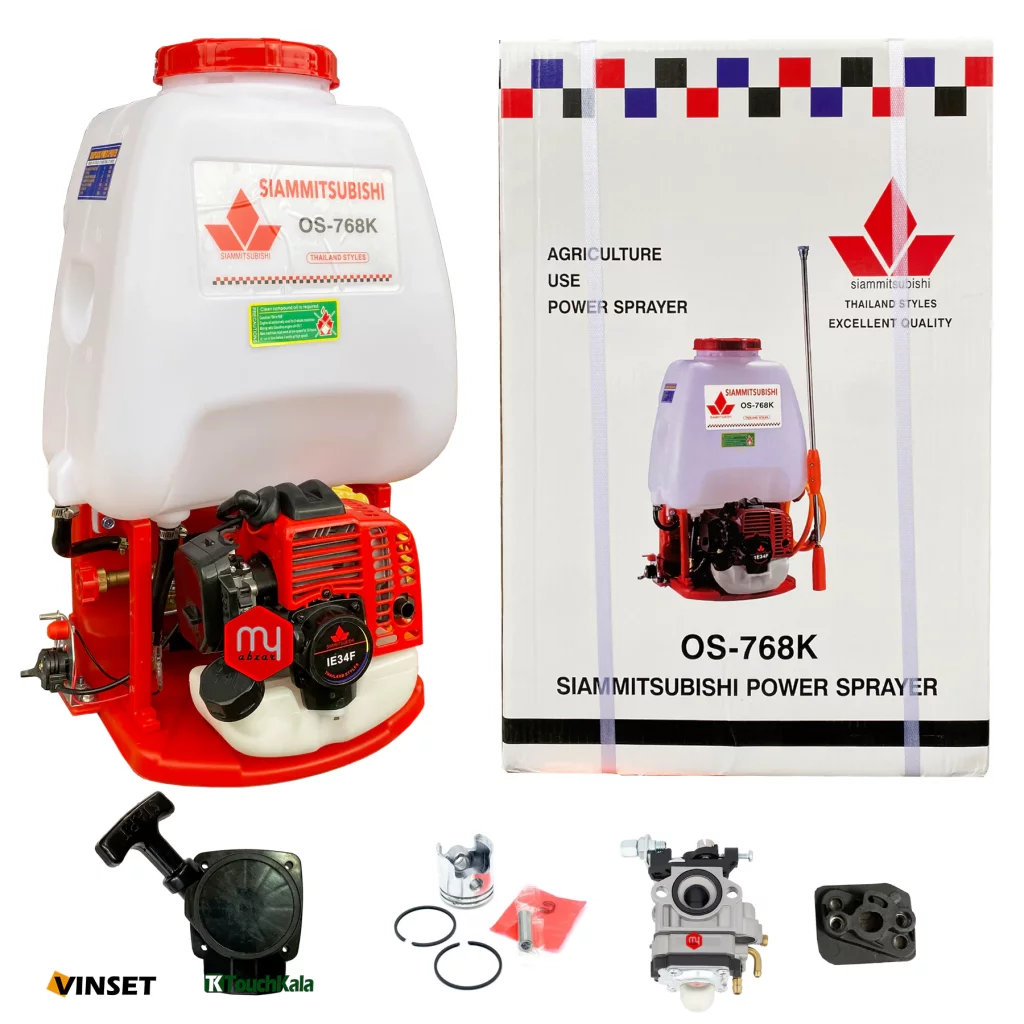 سمپاش پشتی موتوری میتسوبیشی مدل OS 768K با قدرت موتور بنزینی میتسوبیشی مدل IE34F و توان 1.5 اسب بخار با عملکرد دو زمانه و استارت هندلی تولید گردیده است.پمپ سمپاش موتوری میتسوبیشی از نوع پیستونی دو سیلندر می باشد.