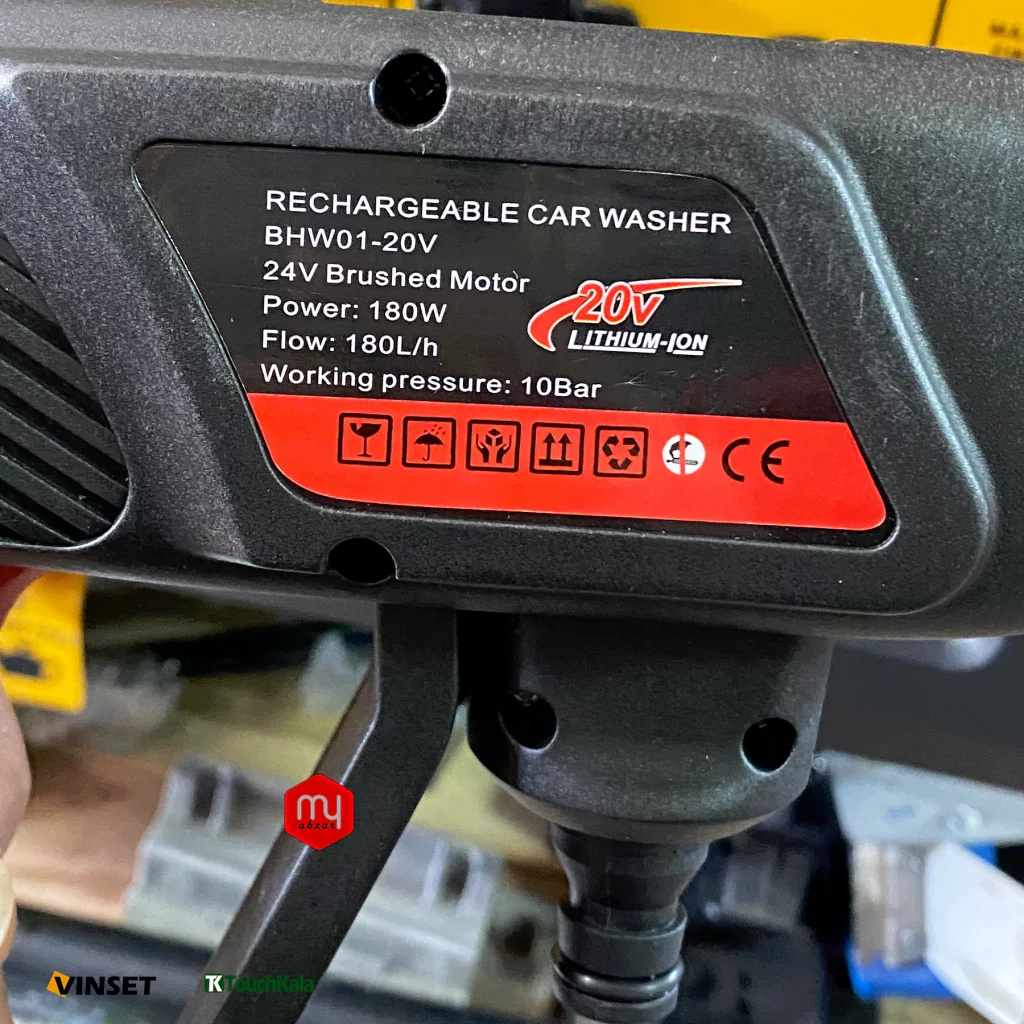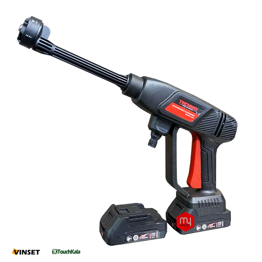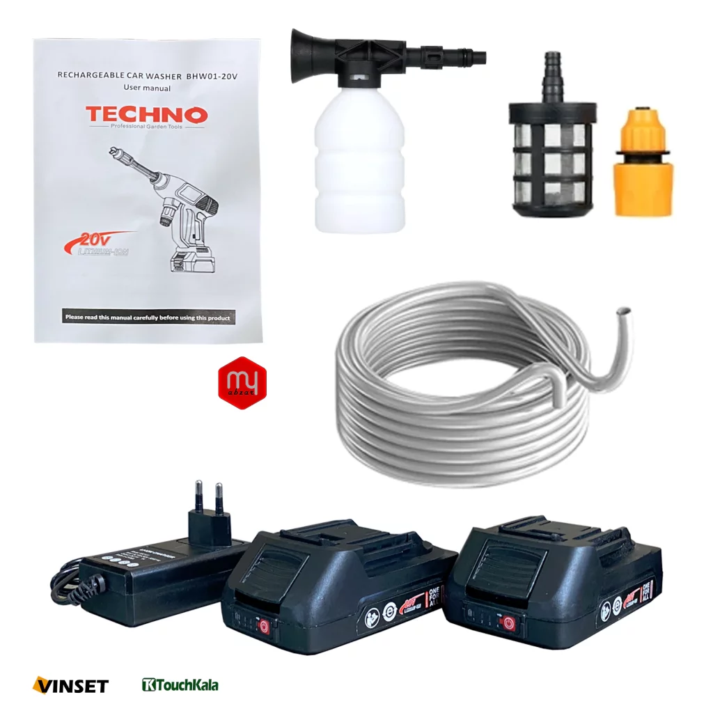 کارواش پرتابل شارژی تکنو مدل BHW01-20V مناسب برای شستشو خودرو در مواقعی که به برق دسترسی ندارید ,کارواش شارژی تکنو همراه با 2 باتری 20 ولت , نازل 6 حالته و مخزن کفپاش همراه با اتصالات مخصوص ارائه میشود