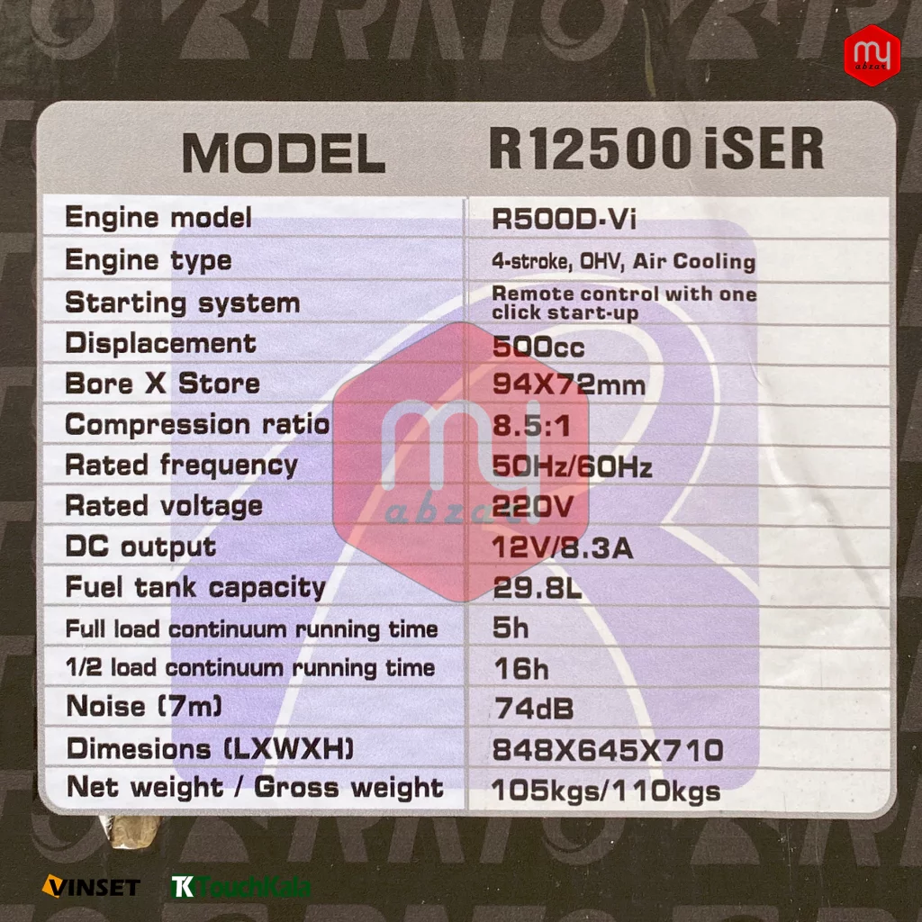 برند و مدل | موتور برق اینورتری راتو 9.5 کیلووات مدل R12500iSER ریموت استارت |