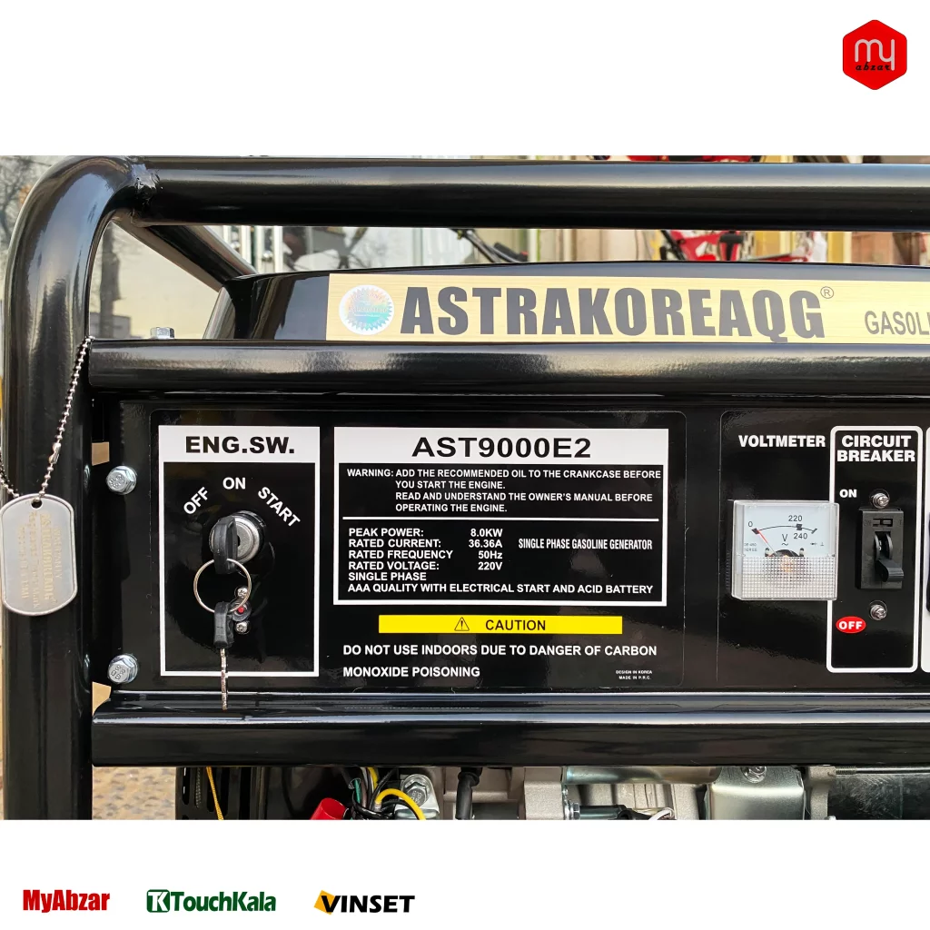 موتور برق استراکره AST9000E2، دارای سنسور سطح روغن، تنظیم کننده دور موتور، سیم پیچ مس میباشد.
