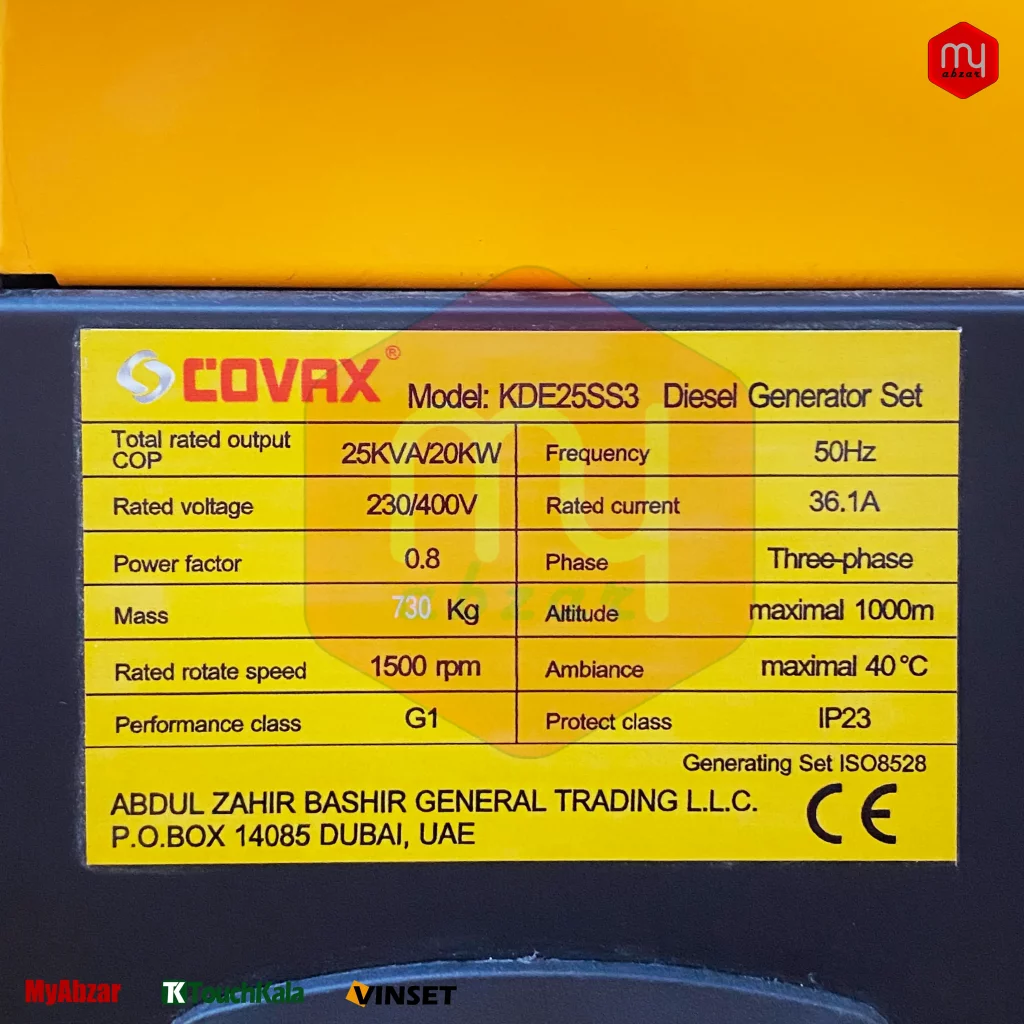 مشخصات فنی موتور برق گازوئیلی کواکس 25 کاوا سایلنت مدل COVAX KDE25SS3
