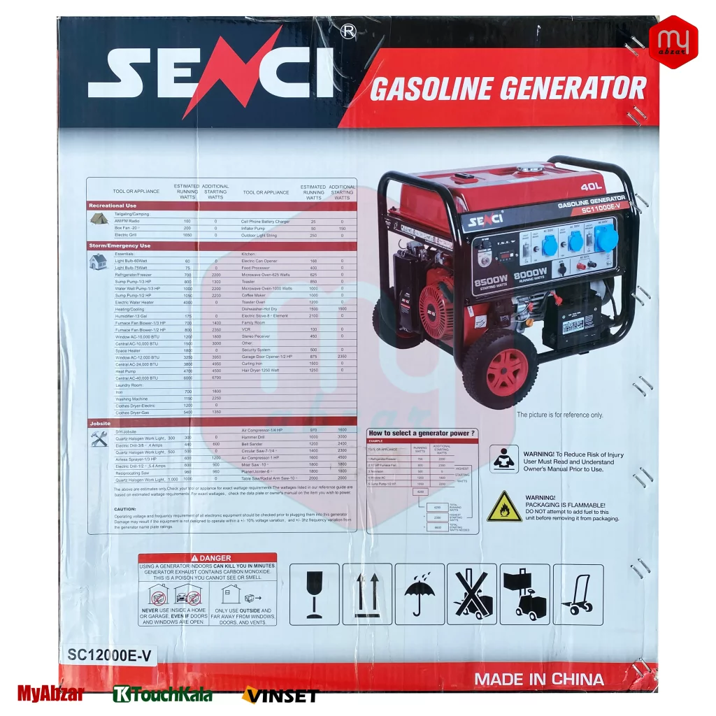 موتور برق سنسی در ابعاد 64.5*56*73.5 سانتیمتر و دارای وزن حدود 112 کیلوگرم را دارد. خوب است بدانید که سوخت مصرفی این دستگاه بنزین است. محصول فوق روی شاسی بسیار مقاوم سوار شده و استارت ان به صورت هندلی و استارتی و ریموت کنترل است.