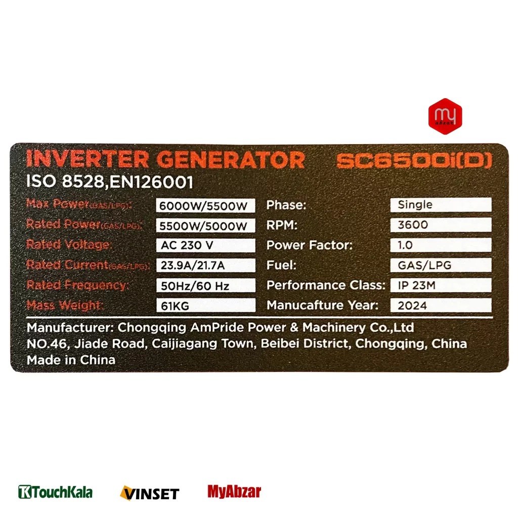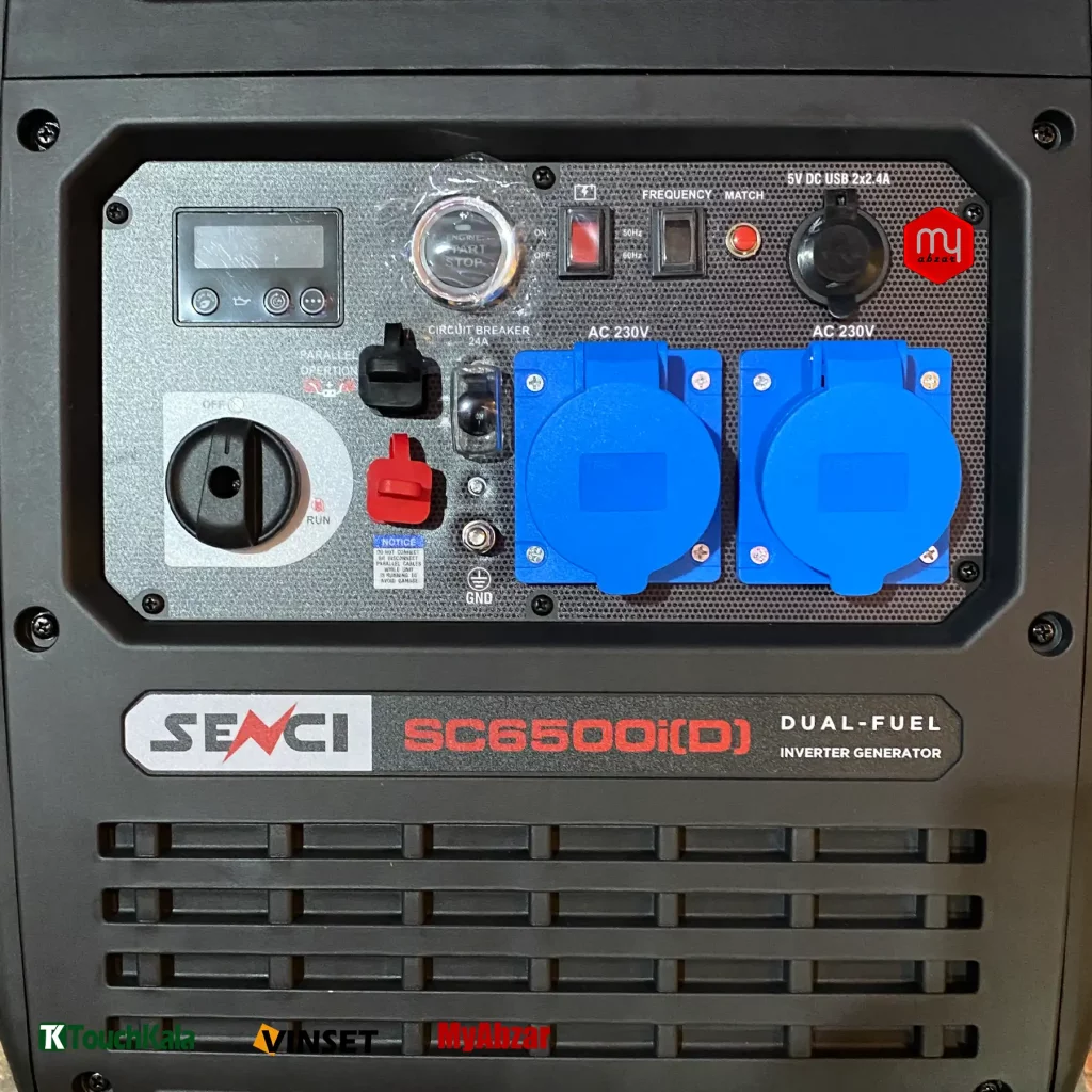 موتور برق سنسی دو گانه 6000 وات، دارای سنسور سطح روغن، تنظیم کننده دور موتور، برد اینورتر میباشد.