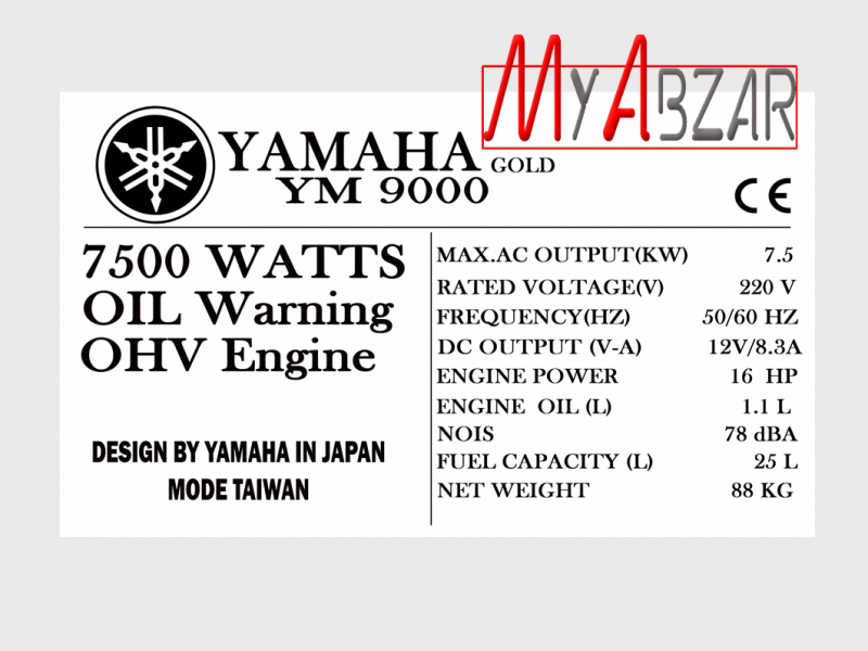موتور برق یاماها 7.5 کیلووات مدل YAMAHA YM-9000 , از نوع موتور هواخنک, چهازمانه و تکفاز میباشد. نوع سوخت قابل استفاده بنزین است. فرکانس 50 هرتز است. دارای موتور قدرتمند به توان 16 اسب است که در حالت اوج به خروجی برق 7500 وات میرسد.