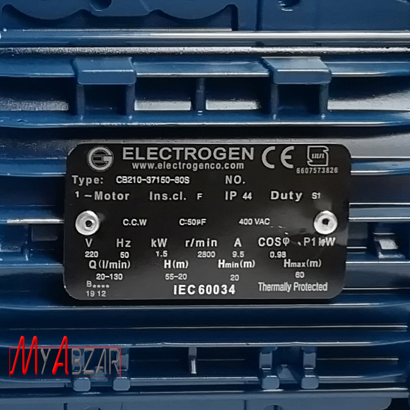 پمپ آب الکتروژن سری CB210 پمپ آب سانتریفیوژ هستند که دارای دو پروانه هستند که فشار قابل توجهی را جهت سیال مصرفی تامین می کند. بدنه پمپ از جنس چدن می باشد و دارای محافظ حرارتی می باشد.2 اسب 2 پروانه جهت بوسترپمپ.